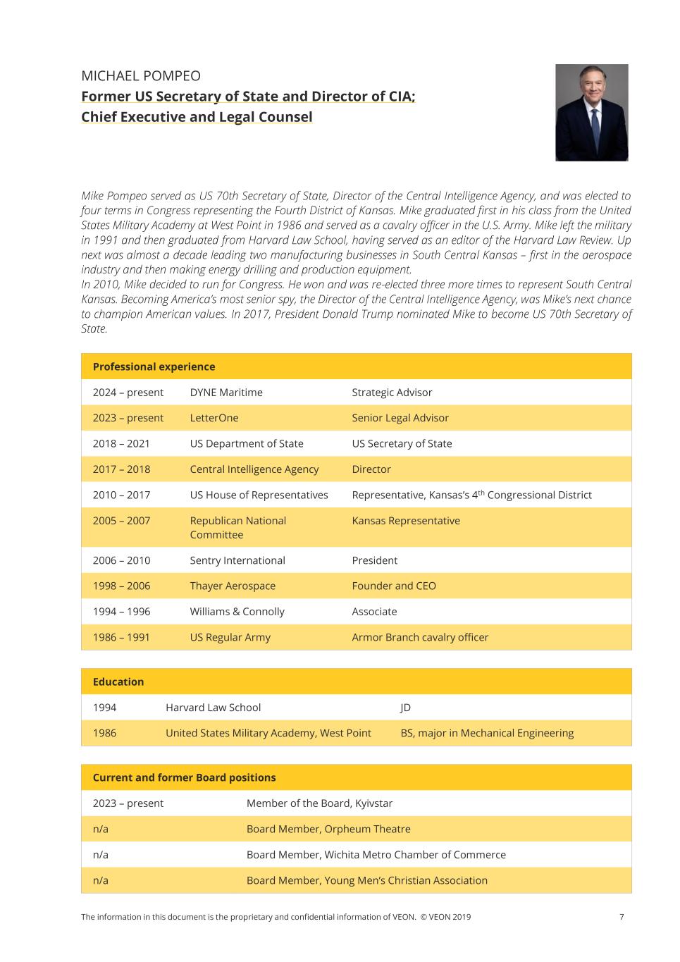 本文档中的信息是VEON的专有和机密信息。© VEON 2019年7迈克尔·蓬佩奥美国前国务卿、中央情报局局长;首席执行官兼法律顾问迈克·蓬佩奥曾担任美国第70任国务卿、中央情报局局长,并代表堪萨斯州第四选区在国会当选四届。迈克1986年以全班第一名的成绩从美国西点军校毕业,曾在美国陆军担任骑兵军官。迈克于1991年离开军队,随后毕业于哈佛法学院,曾担任《哈佛法律评论》的编辑。接下来是在堪萨斯州中南部领导两家制造企业近十年——首先是航空航天工业,然后是制造能源钻探和生产设备。2010年,迈克决定竞选国会议员。他赢了,又三次连任,代表堪萨斯州中南部。成为美国最高级的间谍,中央情报局局长,是迈克捍卫美国价值观的下一个机会。2017年,美国总统唐纳德·特朗普提名迈克成为美国第70任国务卿。专业经验2024 –至今DYNE海事战略顾问2023 –至今LetterOne高级法律顾问2018 – 2021美国国务院美国国务卿2017 – 2018中央情报局局长2010 – 2017美国众议院代表、堪萨斯州第四届国会选区2005 – 2007共和党全国委员会堪萨斯州代表2006 – 2010哨兵国际总裁1998 – 2006 Thayer Aerospace创始人兼首席执行官1994 – 1996 威廉姆斯 & Connolly Associate 1986 – 1991美国正规军装甲分部骑兵军官教育1994哈佛大学法学院1994 丨京东 1986美国军事学院,西点军校学士,机械工程专业现任和前任董事会职务2023年–现任董事会成员,Kyivstar不适用董事会成员,Orpheum Theatre不适用董事会成员,威奇托地铁商会不适用董事会成员,青年男子基督教协会