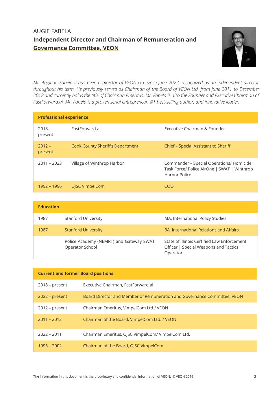 本文档中的信息是VEON的专有和机密信息。© VEON 2019年3月3日AUGIE FABELA独立董事兼薪酬与治理委员会主席、VEONTERM1Augie K. Fabela IIVEON先生自2022年6月起担任TERM3 Ltd.董事,确认为独立董事,任期届满。此前于2011年6月至2012年12月担任VEON董事会主席,现任名誉主席职称。Fabela先生也是FastForward.AI的创始人和执行主席。Fabela先生是一位久经考验的连续创业者、#畅销书作家、创新领袖。专业经验2018 –至今FastForward.AI执行主席兼创始人2012 –至今库克县警长部门主管–警长特别助理2011 – 2023年温思罗普港指挥官村–特别行动/凶杀特遣部队/警察AirOne |特警|温思罗普港警察1992 – 1996 OJSC VimpelCom COO教育1987斯坦福大学硕士,国际政策研究1987斯坦福大学学士,国际关系和事务警察学院(NEMRT)和网关特警操作员学校伊利诺伊州认证执法官员|特殊武器和战术操作员现任和前任董事会职务2018 –至今执行主席,FastForward.ai 2022 –现任董事会董事、薪酬与治理委员会成员,VEON 2012 –现任VimpelCom Ltd./VEON 2011 – 2012董事会主席,VimpelCom Ltd./VEON 2022 – 2011董事会主席,OJSC VimpelCom/VimpelCom Ltd.董事会主席,1996 – 2002 OJSC VimpelCom董事会主席