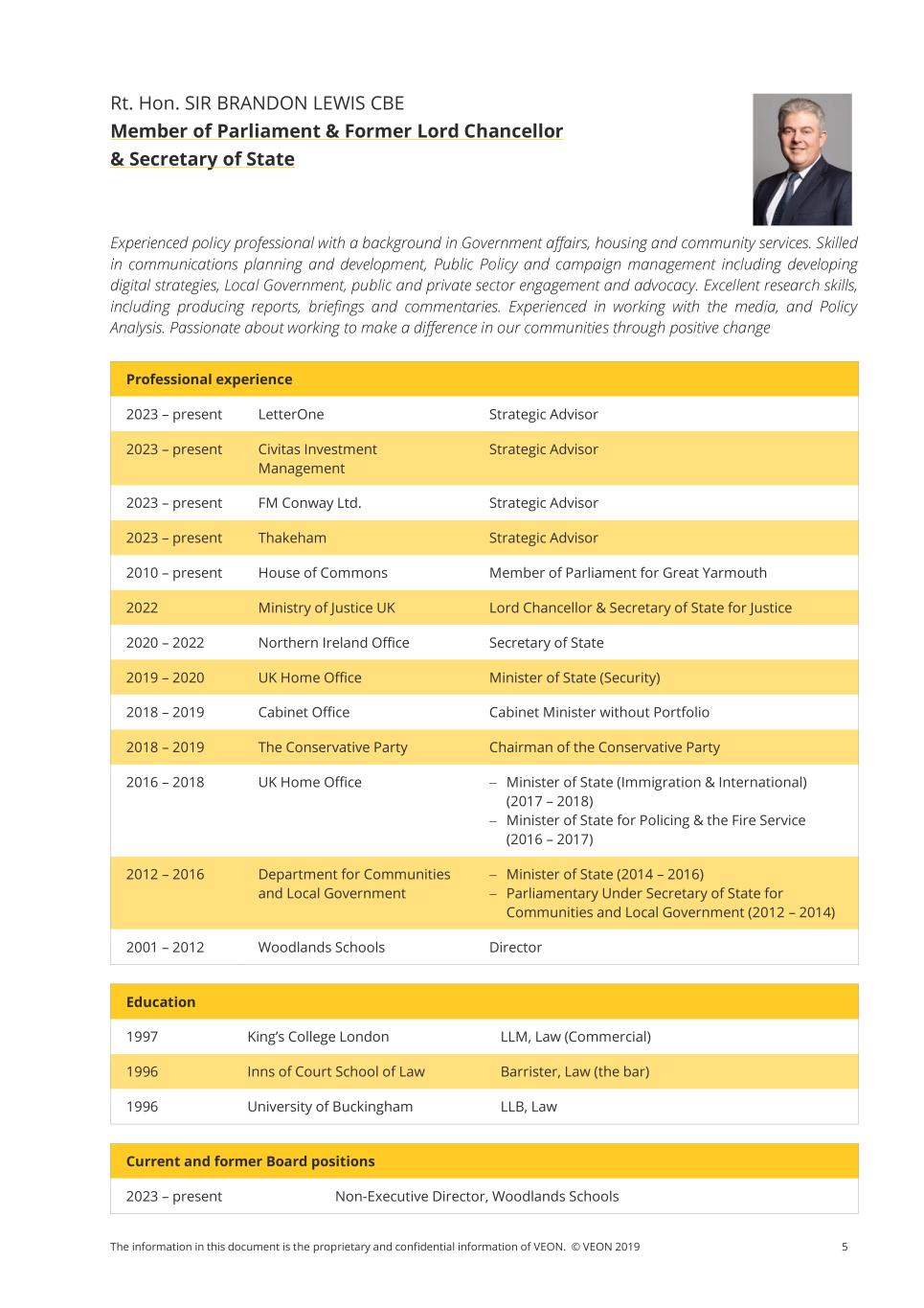 本文档中的信息是VEON的专有和机密信息。© VEON 20195 RT。BANDON LEWIS爵士CBE议员兼前大法官兼国务卿经验丰富的政策专业人士,具有政府事务、住房和社区服务背景。熟练掌握通信规划和开发、公共政策和竞选管理,包括制定数字战略、地方政府、公共和私营部门的参与和宣传。出色的研究技能,包括制作报告、简报和评论。与媒体合作经验丰富,政策分析。对通过积极变革为我们的社区带来改变充满热情专业经验2023 – present LetterOne Strategic Advisor 2023 – present Civitas Investment Management Strategic Advisor 2023 – present FM Conway Ltd. Strategic Advisor 2023 – present Thakeham Strategic Advisor 2010 – present House of Commons Member of Parliament for Great Yarmouth 2022 Ministry of Justice UK Lord Chancellor & Secretary司法2020 – 2022北爱尔兰办公室国务大臣2019 – 2020英国内政部国务大臣(安全)2018 – 2019内阁办公室内阁大臣无职务2018 – 2019保守党主席2016 – 2018英国内政部−国务大臣(移民和国际)(2017 – 2018)−警务和消防事务国务大臣(2016 – 2017)2012 – 2016社区和地方政府部−国务大臣(2014 – 2016)−议会副国务大臣社区和地方政府(2012 – 2014)2001 – 2012 Woodlands Schools Director Education 1997 King’s College London LLM,Law(Commercial)1996 Inns of Court法学院大律师,Law(the bar)1996 University of Buckingham LLB,Law现任和前任董事会职位2023 –现任Woodlands Schools非执行董事