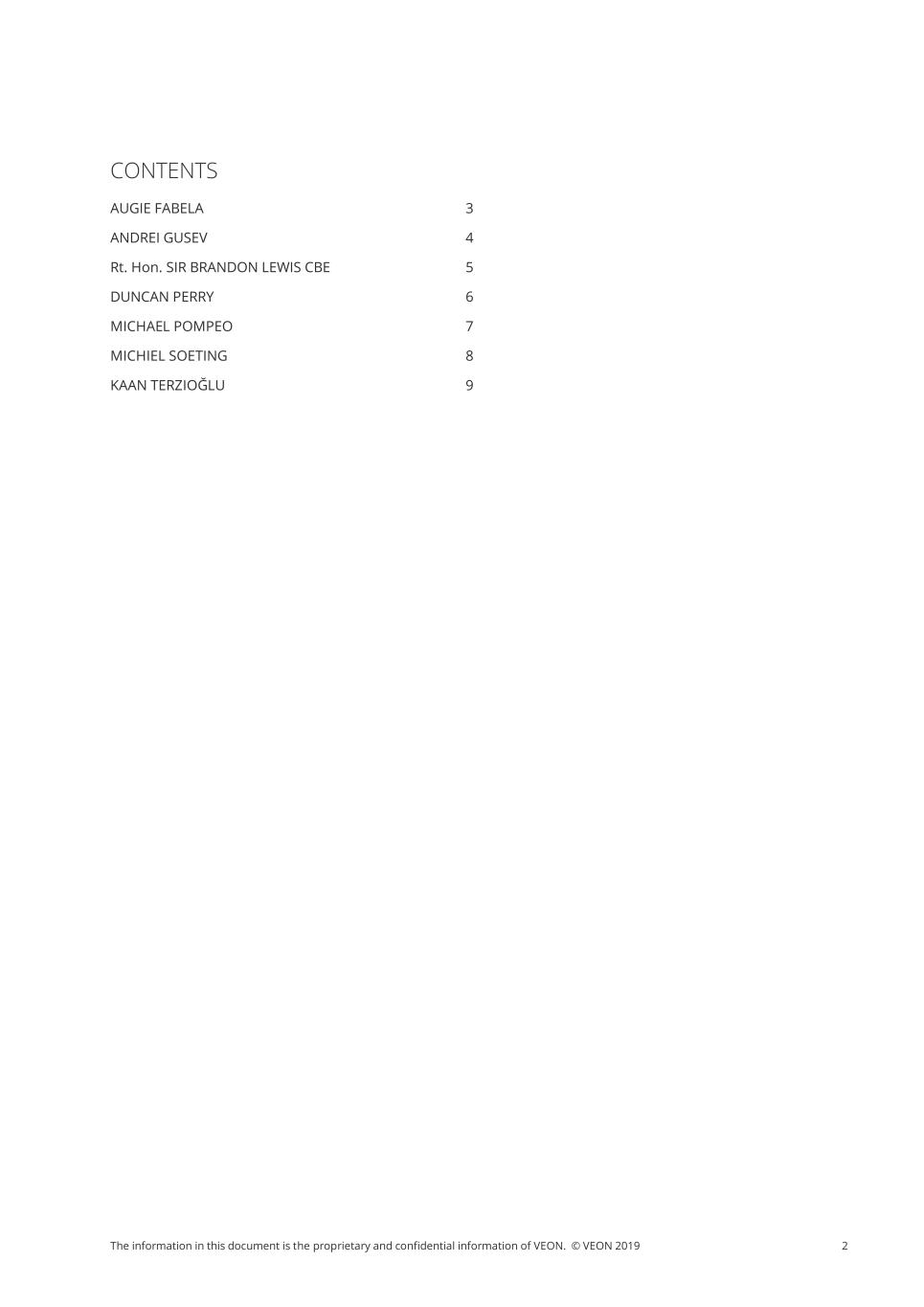 本文档中的信息是VEON的专有和机密信息。© VEON 20192内容AUGIE FABELA 3 ANDREI GUSEV 4 RT. Hon. Sir Brandon LEWIS CBE 5 DUNCAN PERRY 6 Michael POMPEO 7 MICHIEL SOETING 8 KAAN TERZIO LU 9