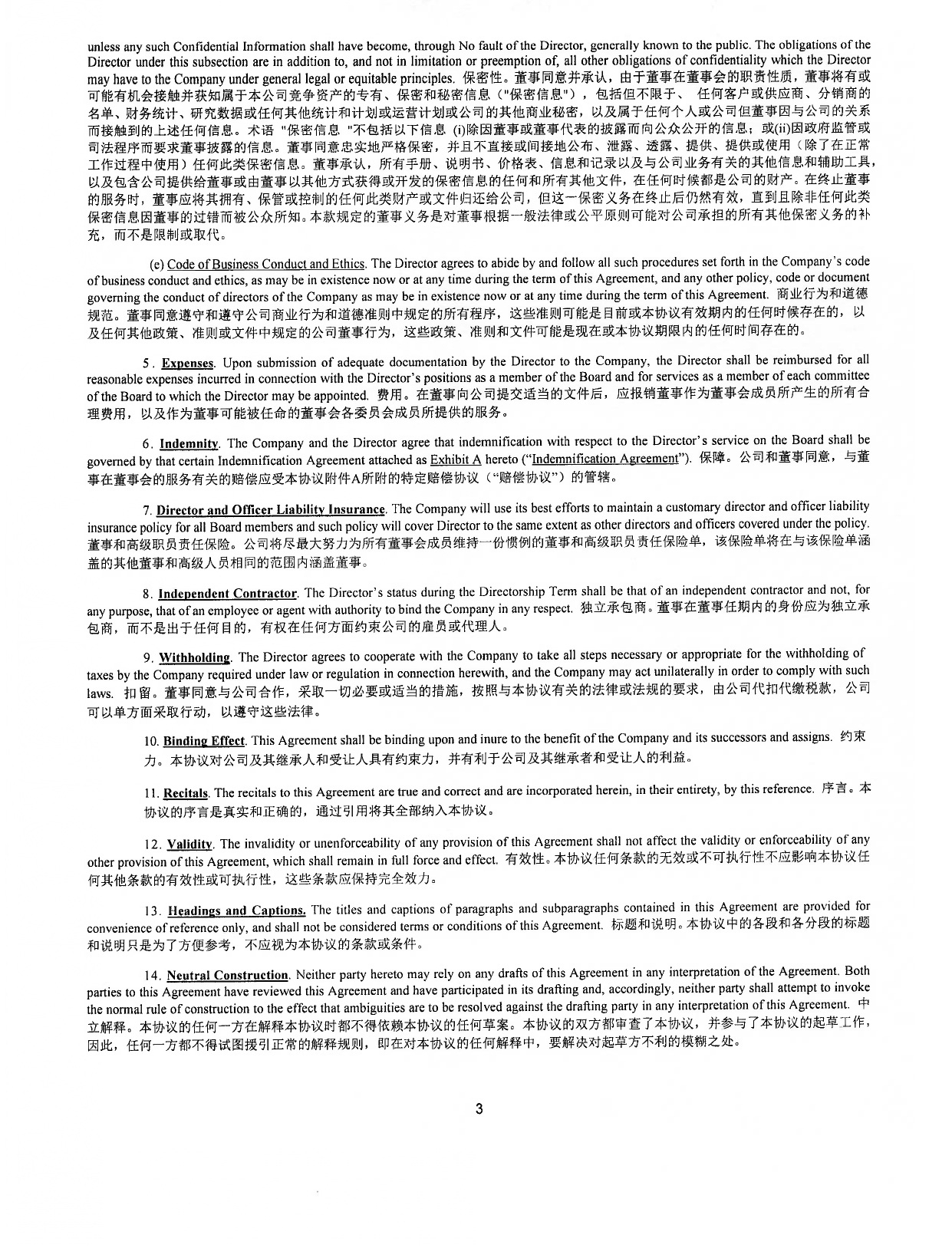 作为证明,本协议各方自生效之日起已签立本董事协议。