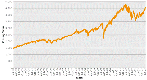 | 标普500®指数–历史收盘价 2013年1月2日至2023年8月3日 |