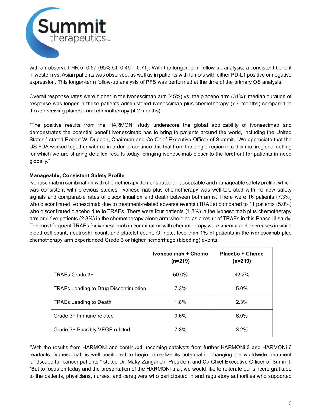 3,观察到的HR为0.57(95% CI:0.46 – 0.71)。随着更长期的随访分析,观察到在西方与亚洲患者中以及在PD-L1阳性或阴性表达的肿瘤患者中的一致获益。这种对PFS的较长期随访分析是在进行主要OS分析时进行的。ivonescimab组(45%)的总体应答率高于安慰剂组(34%);与接受安慰剂和化疗的患者(4.2个月)相比,接受ivonescimab加化疗的患者(7.6个月)的中位应答持续时间更长。Summit董事长兼联席首席执行官Robert W. Duggan表示:“HarMONI研究的积极结果凸显了ivonescimab的全球适用性,并证明了ivonescimab可以为包括美国在内的世界各地的患者带来潜在益处。”“我们感谢美国FDA与我们合作,以便将这项试验从单一区域延续到我们今天分享详细结果的多区域环境,让ivonescimab更接近全球有需求患者的前沿。”可管理、一致的安全性情况伊沃奈西单抗联合化疗证明了可接受和可管理的安全性情况,这与先前的研究一致。伊沃奈西单抗加化疗耐受性良好,没有新的安全信号,两臂停药和死亡率相当。因治疗相关不良事件(TRAE)停用ivonescimab的患者为16例(7.3%),而因TRAE停用安慰剂的患者为11例(5.0%)。在这项III期研究中,ivonescimab加化疗组有4名患者(1.8%)和单独化疗组有5名患者(2.3%)因TRAE死亡。ivonescimab联合化疗最常见的TRAE是贫血和白细胞计数、中性粒细胞计数、血小板计数下降。值得注意的是,在ivonescimab加化疗组中,只有不到1%的患者经历了3级或更高级别的出血(出血)事件。ivonescimab + Chemo(n = 219)Placebo + Chemo(n = 219)TRAEs 3级+ 50.0% 42.2% TRAEs导致药物停用7.3% 5.0% TRAEs导致死亡1.8% 2.3% 3级+免疫相关9.6% 6.0% 3级+可能与VEGF相关7.3% 3.2% Summit总裁兼联席首席执行官Maky Zanganeh博士表示:“有了HarMONI的结果以及来自进一步的HarMONI-2和HarMONI-6读数的持续即将到来的催化剂,ivonescimab已经做好准备,开始实现其在改变全球癌症患者治疗前景方面的潜力。”“但要重点关注今天和Harmoni试验的介绍,我们要重申,我们对参与的患者、医生、护士、护理人员以及支持的监管当局表示衷心感谢