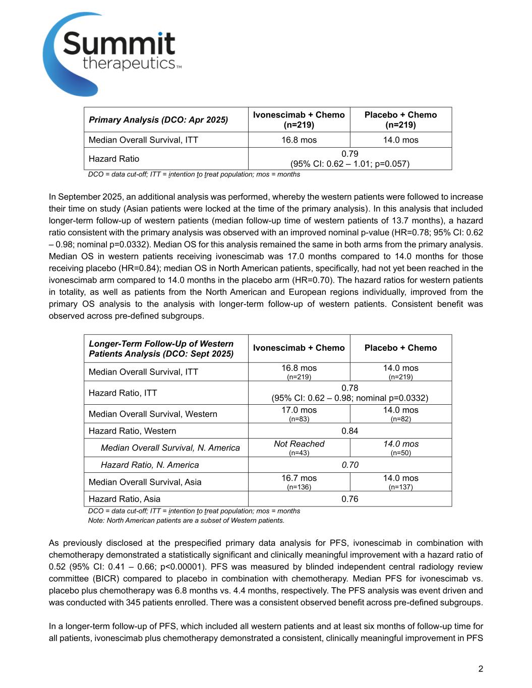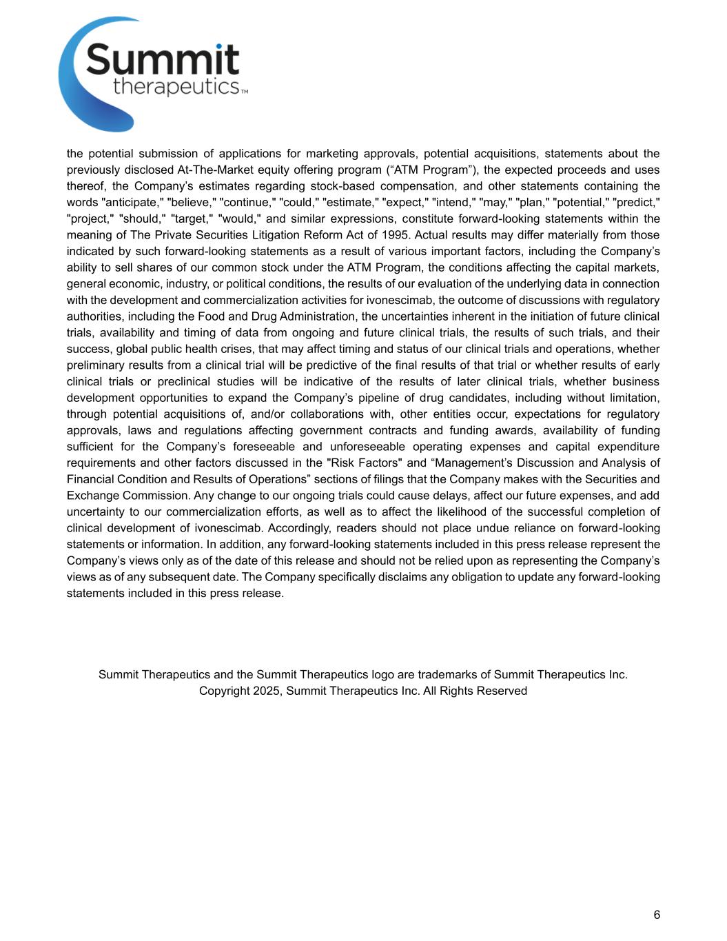6可能提交的上市批准申请、潜在收购、有关先前披露的市场股票发行计划(“ATM计划”)的陈述、预期收益及其用途、公司关于基于股票的薪酬的估计,以及包含“预期”、“相信”、“继续”、“可能”、“估计”、“预期”、“打算”、“可能”、“计划”、“潜在”、“预测”、“项目”、“应该”、“目标”、“将”和类似表述,构成1995年《私人证券诉讼改革法案》含义内的前瞻性陈述。由于各种重要因素,实际结果可能与此类前瞻性陈述所表明的结果存在重大差异,包括公司根据ATM计划出售我们普通股的能力、影响资本市场的条件、总体经济、行业或政治状况、我们对与ivonescimab的开发和商业化活动相关的基础数据的评估结果、与包括美国食品药品监督管理局在内的监管机构讨论的结果、未来临床试验启动所固有的不确定性,来自正在进行和未来临床试验的数据的可用性和时间、此类试验的结果及其成功、全球公共卫生危机,这可能会影响我们临床试验和运营的时间和状态,临床试验的初步结果是否会预测该试验的最终结果,或早期临床试验或临床前研究的结果是否会指示后期临床试验的结果,是否会出现扩大公司候选药物管道的商业发展机会,包括但不限于通过潜在收购和/或与其他实体合作,对监管批准的预期、影响政府合同和资金奖励的法律法规、足以满足公司可预见和不可预见的运营费用和资本支出要求的资金的可用性以及公司向美国证券交易委员会提交的文件的“风险因素”和“管理层对财务状况和运营结果的讨论和分析”部分中讨论的其他因素。我们正在进行的试验的任何变化都可能导致延误,影响我们未来的开支,并为我们的商业化努力增加不确定性,以及影响成功完成ivonescimab临床开发的可能性。因此,读者不应过分依赖前瞻性陈述或信息。此外,本新闻稿中包含的任何前瞻性陈述仅代表公司截至本新闻稿发布之日的观点,不应被视为代表公司截至任何后续日期的观点。该公司明确表示不承担更新本新闻稿中包含的任何前瞻性陈述的任何义务。Summit Therapeutics及Summit Therapeutics Inc.Summit Therapeutics标识为Summit Therapeutics Inc.版权所有2025的商标,TERM3保留所有权利