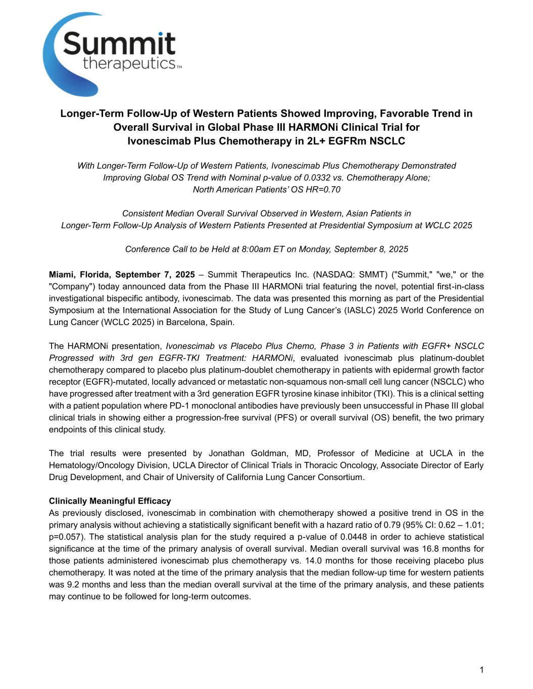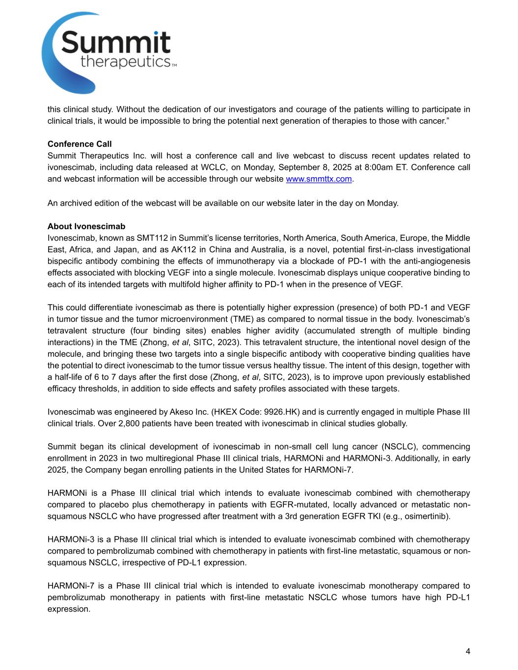 4本临床研究。没有我们研究人员的奉献精神和愿意参与临床试验的患者的勇气,就不可能为癌症患者带来潜在的下一代疗法。”电话会议Summit Therapeutics Inc.将于美国东部时间2025年9月8日星期一上午8:00举办电话会议和网络直播,讨论与ivonescimab相关的最新更新,包括在WCLC上发布的数据。电话会议和网络直播信息可通过我们的网站www.smmttx.com查阅。网络直播的存档版本将于周一晚些时候在我们的网站上提供。关于ivonescimab ivonescimab,在Summit的许可地区、北美、南美、欧洲、中东、非洲和日本被称为SMT112,在中国和澳大利亚被称为AK112,是一种新型的、潜在的first-in-class在研双特异性抗体,将通过阻断PD-1的免疫疗法的效果与与将VEGF阻断成单一分子相关的抗血管生成作用相结合。当存在VEGF时,ivonescimab以对PD-1的多倍更高亲和力与其每个预期靶点显示出独特的合作结合。这可以区分ivonescimab,因为与体内正常组织相比,PD-1和VEGF在肿瘤组织和肿瘤微环境(TME)中的表达(存在)可能更高。ivonescimab的四价结构(四个结合位点)使TME具有更高的亲和力(多重结合相互作用的积累强度)(Zhong,et al,SITC,2023)。这种四价结构,有意对分子进行新颖设计,并将这两个靶点带入具有协同结合品质的单一双特异性抗体中,有可能将ivonescimab导向肿瘤组织而不是健康组织。这种设计的目的,连同第一次给药后6至7天的半衰期(Zhong,et al,SITC,2023),除了与这些靶点相关的副作用和安全性特征外,还旨在改善先前确定的疗效阈值。Ivonescimab由Akeso Inc.(港交所代码:9926.HK)设计,目前正在进行多个III期临床试验。全球已有超过2800名患者在临床研究中接受了ivonescimab治疗。Summit开始其ivonescimab在非小细胞肺癌(NSCLC)中的临床开发,于2023年开始在两项多区域III期临床试验中注册,即HarMONI和HarMONI-3。此外,2025年初,该公司开始在美国为HARMONI-7招募患者。Harmoni是一项III期临床试验,旨在评估ivonescimab联合化疗与安慰剂联合化疗在EGFR突变、局部晚期或转移性非鳞状NSCLC患者中的比较,这些患者在使用第3代EGFR TKI(例如奥希替尼)治疗后出现进展。Harmoni-3是一项III期临床试验,旨在评估ivonescimab联合化疗与pembrolizumab联合化疗在一线转移性、鳞状或非鳞状NSCLC患者中的比较,无论PD-L1表达如何。HARMONi-7是一项III期临床试验,旨在评估肿瘤PD-L1高表达的一线转移性NSCLC患者中ivonescimab单药治疗与pembrolizumab单药治疗的对比。