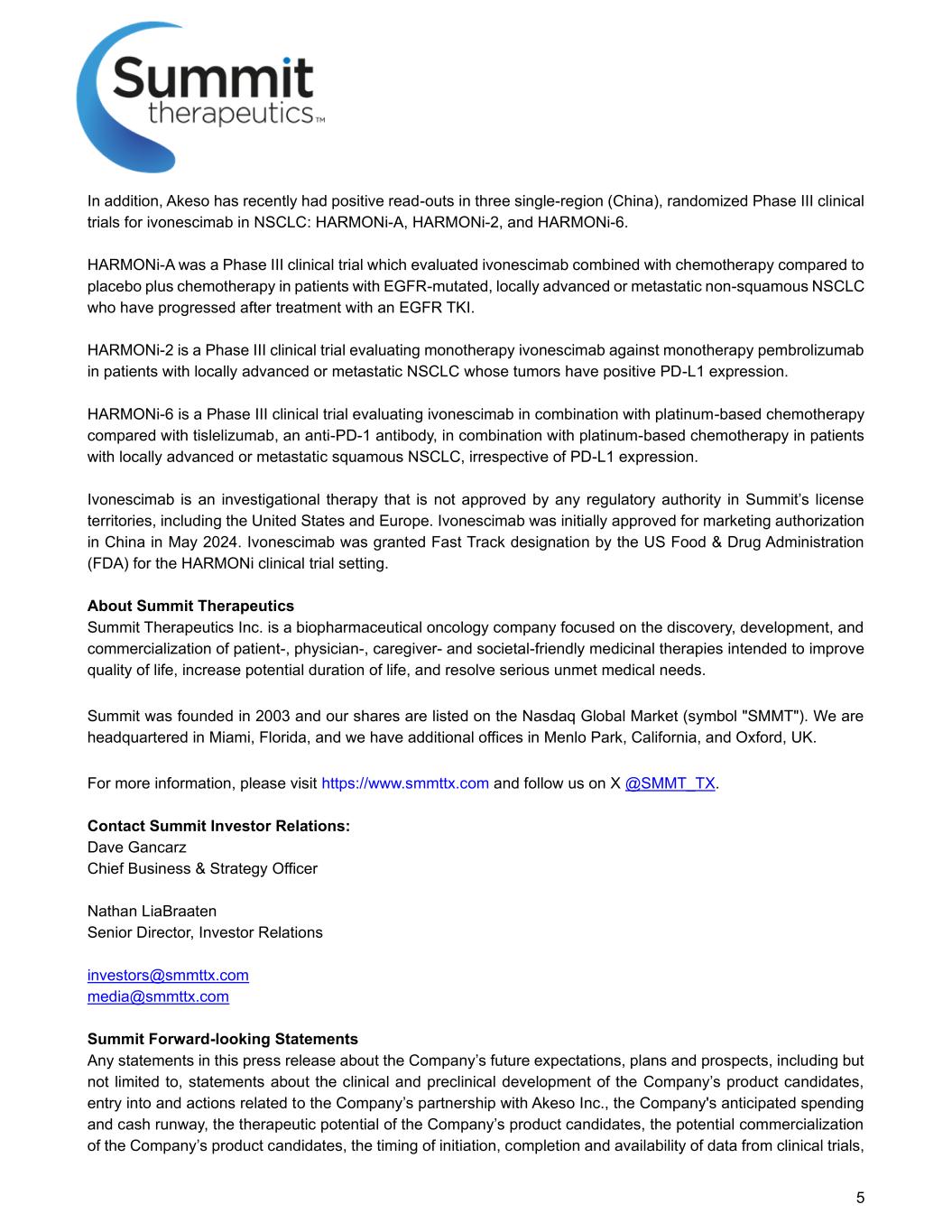 5此外,Akeso近期在3个单区(中国)、iVonescimab治疗NSCLC的随机III期临床试验中均有阳性读数:HARMONI-A、HARMONI-2、HARMONI-6。HARMONi-A是一项III期临床试验,评估了ivonescimab联合化疗与安慰剂联合化疗在EGFR TKI治疗后进展的EGFR突变、局部晚期或转移性非鳞状NSCLC患者中的比较。HARMONI-2是一项III期临床试验,评估单一疗法ivonescimab对抗单一疗法pembrolizumab在肿瘤PD-L1表达阳性的局部晚期或转移性NSCLC患者中的作用。Harmoni-6是一项III期临床试验,评估ivonescimab联合铂类化疗与抗PD-1抗体替雷利珠单抗联合铂类化疗在局部晚期或转移性鳞状NSCLC患者中的疗效,无论PD-L1表达如何。Ivonescimab是一种研究性疗法,未获得Summit许可地区任何监管机构的批准,包括美国和欧洲。伊沃奈司单抗最初于2024年5月在中国获批上市许可。Ivonescimab被美国食品药品监督管理局(FDA)授予HarMONI临床试验设置的快速通道指定。关于Summit TherapeuticsSummit Therapeutics公司是一家生物制药肿瘤学公司,专注于发现、开发和商业化对患者、医生、护理人员和社会友好的药物疗法,旨在提高生活质量,增加潜在的生命持续时间,并解决严重的未满足的医疗需求。Summit成立于2003年,我们的股票在纳斯达克全球市场上市(代码“SMMT”)。我们的总部设在佛罗里达州迈阿密,并在加利福尼亚州门洛帕克和英国牛津增设了办事处。欲了解更多信息,请访问https://www.smmttx.com,关注我们X @SMMT _ TX。联系峰会投资者关系:Dave Gancarz首席业务和战略官Nathan LiaBraaten投资者关系高级总监Investors@smmttx.com media@smmttx.com峰会前瞻性声明本新闻稿中关于公司未来预期、计划和前景的任何声明,包括但不限于关于公司候选产品的临床和临床前开发、与公司与Akeso Inc.的合作关系相关的进入和行动的声明、公司预期的支出和现金跑道、公司候选产品的治疗潜力、公司候选产品的潜在商业化、启动时间,临床试验数据的完成和可用性,