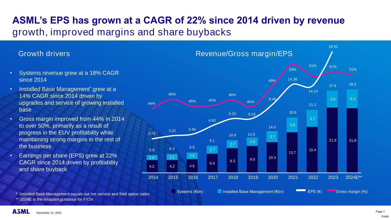 大众ASML的技术领先地位来自战略投资,这些投资能够为我们的客户实现具有成本效益的创新,通过对研发和资本支出的投资实现有机增长战略收购以及对•技术和产能供应链的投资(Carl Zeiss SMT,Berliner Glas)•新业务(HMI)第6页*ASML贡献截至2017年包含的蔡司SMT资本支出**2024E是对2024财年数字的估计增长方法研发资本支出投资2014201520162017*2018年2019年2020年2021年2022年2023年2024E**1,11,11,11,11,31,62,0 2,22,53,34,04,30,40,40,30,40,40,60,91,00,91,32,21,91,41,41,62,22,93,23,54,66,26,2 Berliner Glas acquisition Carl Zeiss SMT Holding acquisition 24.9% interest HMI acquisition EUN(EUN 10 billion)(EUN 28 billion)(EUN 03 billion)November 14,2024