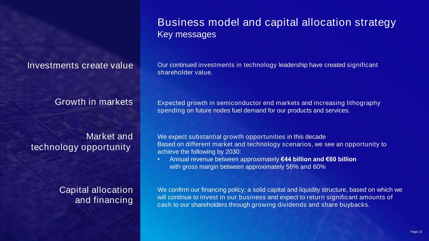 公共商业模式和资本配置策略我们对技术领先地位的持续投资创造了重要的股东价值。投资创造价值我们预计这十年将有巨大的增长机会基于不同的市场和技术场景,我们看到了到2030年实现以下目标的机会:•年收入约为440亿欧元至600亿欧元,毛利率约为56%至60%市场和技术机会半导体终端市场的预期增长以及未来节点上光刻支出的增加推动了对我们产品和服务的需求。市场增长我们确认我们的融资政策;坚实的资本和流动性结构,基于此我们将继续投资于我们的业务,并期望通过不断增长的股息和股票回购向我们的股东返还大量现金。资本分配和融资关键信息第23页