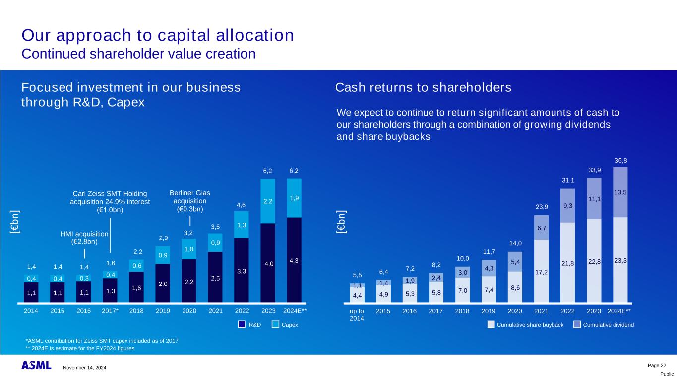 公开第21页我们的资本配置和融资方法以强大而灵活的资产负债表为支持,重点投资于我们的业务资本配置•为执行ASML的长期路线图而进行的投资•对股东的现金回报•可持续的每股股息将随着时间的推移而增长,按季度支付•通过股票回购融资将多余的现金返还给股东•保持充足的流动性以确保业务的持续增长并为现金流波动提供缓冲•维持以稳健的投资级信用评级为目标的资本结构2024年11月14日