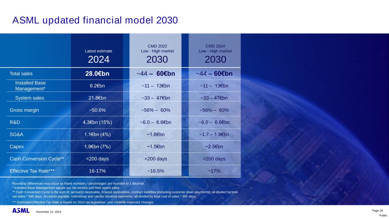 公共毛利率发展潜力FY25 – FY30第17页• EUV:0.33 NA系统的销量增长和生产力提高对整体通用汽车产生积极影响。0.55 NA系统中的量增长对GM整体有小幅稀释效应•非EUV:GM增量主要由量增驱动。这种积极的转基因影响被产品组合的变化(更多的DUV干式系统)部分抵消。• IBM*:通用汽车因安装基数增长而增长,并向更多基于价值的服务和升级迈进*IBM = Installed Base Management,等于我们的净服务和现场期权业务利润率增长驱动因素ASML 2025 – 2030毛利率桥梁(中点到中点指导)~58% 2030毛利率%~52% 2025毛利率% FY30 GM % IBM*非EUVEUVFY25 GM % 2025-2030 GM %发展~4%~1%~1% 2024年11月14日
