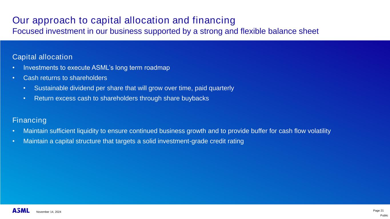 公共商业模式和资本配置策略我们对技术领先地位的持续投资创造了重要的股东价值。投资创造价值我们预计这十年将有巨大的增长机会基于不同的市场和技术场景,我们看到了到2030年实现以下目标的机会:•年收入约为440亿欧元至600亿欧元,毛利率约为56%至60%市场和技术机会半导体终端市场的预期增长以及未来节点上光刻支出的增加推动了对我们产品和服务的需求。市场增长我们确认我们的融资政策;坚实的资本和流动性结构,基于此,我们将继续投资于我们的业务,并期望通过不断增长的股息和股票回购向我们的股东返还大量现金。资本分配和融资关键信息2024年11月14日