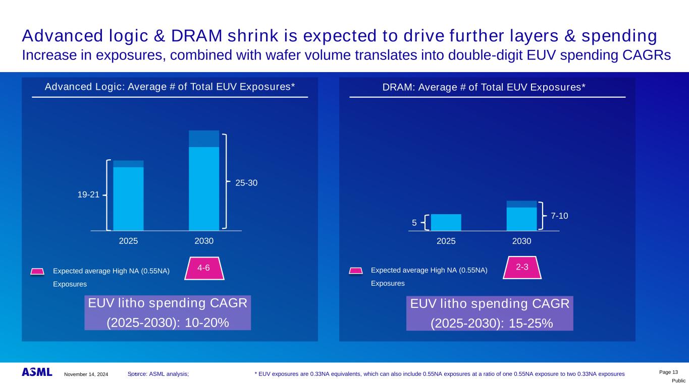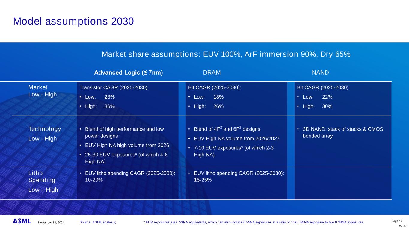 Public Advanced Logic & DRAM收缩有望推动更多层&支出增加曝光量,结合晶圆量转化为两位数的EUV支出CAGR第13页Advanced Logic:EUV总曝光量的平均#*EUV litho支出CAGR(2025-2030):10-20 % 2024年11月14日;*数据来源:ASML分析;*EUV曝光量为0.33NA当量,其中还可以包括0.55NA暴露,比例为1个0.55NA暴露与2个0.33NA暴露20252030 19-21 25-30 DRAM:EUV总暴露的平均#*EUV litho支出CAGR(2025-2030):15-25 % 20252030 5 7-10 4-6预期平均高NA(0.55NA)暴露2-3预期平均高NA(0.55NA)暴露
