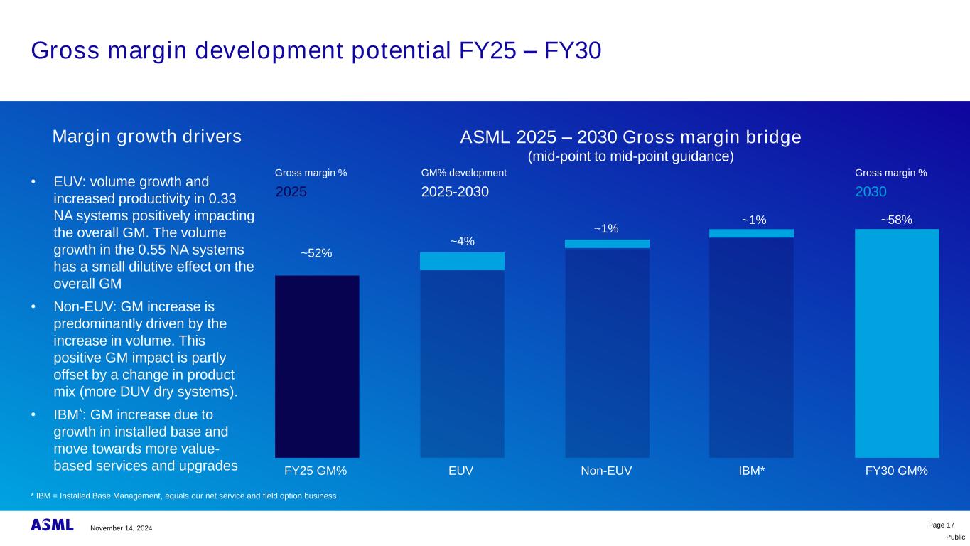 Public We still model a total sales opportunity between 44B eUs and 60B eUs to 2030 Total sales opportunity(in eUs bn)page 16*M & I:计量与检测**已安装的基地管理等于我们的净服务和现场选项销售高场景EUV销售3232非EUV销售(Litho和M & I*)1515装机基地管理**1313总计6060中等场景EUV销售26非EUV销售(Litho和M & I*)14装机基地管理**12合计52低场景EUV销量2222非EUV销量(Litho和M & I*)1111已安装底座管理**1111总计4444 CMD2024销售2030未在CMD2022中报告逻辑:与CMD2022相比,我们预计•先进节点晶圆需求略高,但被节点时间的转变所抵消•战略顺风,特别是代工竞争,较低•主流节点晶圆需求略低内存:与CMD2022相比,我们预计• DRAM晶圆需求更高,受HPC/AI推动•从多个图案化EUV转向单一图案化EUV(0.33 NA和0.55 NA)• NAND晶圆需求较低综合来看,这些驱动因素导致的销售前景与我们在CMD 2022中显示的相似,范围为44B欧元-60B欧元CMD 2022销售2030年我们2030年销售机会的关键驱动因素是:2024年11月14日