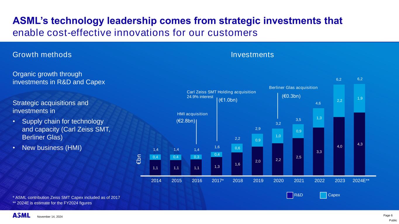 公开前瞻性陈述本文件和相关讨论包含1995年美国《私人证券诉讼改革法案》含义内的前瞻性陈述,包括关于我们的战略、计划和预期趋势的陈述,包括终端市场和技术行业的趋势和商业环境趋势,包括人工智能的出现及其对半导体行业的潜在机会和期望,包括计算能力、先进逻辑节点和DRAM存储器,关于摩尔定律和到2030年预期晶体管增长和期望的陈述,全球市场趋势和技术、产品和客户路线图,长期展望和预期光刻和半导体行业增长和趋势以及到2030年及以后的半导体销售和半导体市场机会的预期增长、晶圆需求和产能的预期增长以及额外的晶圆产能要求、我们客户的预期投资,包括对我们的技术和晶圆产能的投资、增加产能的计划、光刻支出的预期增长、增长机会,包括服务和升级的增长机会以及已安装基地管理销售的增长机会、整体光刻业务的预期增长和毛利率以及应用产品的预期潜在市场,不断增长的安装基数的预期和收益、ASML及其供应商的产能、系统的预期产量、模型场景和2030年的更新模型,包括2030年的年收入和毛利率机会和发展潜力、展望和预期、建模或潜在的财务结果,包括收入机会、毛利率、研发成本、SG & A成本、资本支出、现金转换周期和2030年的年化有效税率,以及这些预期、建模或潜在金额背后的假设和驱动因素,以及我们的业务和财务模型背后的其他假设、预期趋势,半导体终端市场的前景和增长以及长期增长机会、需求和需求驱动因素、我们产品的预期机会和增长驱动因素以及技术创新,包括DUV EUV、High NA、Hyper NA、Applications和其他影响生产力和成本的产品、晶体管尺寸、逻辑和DRAM收缩、代工竞争、关于股息和股票回购的声明以及我们的资本回报政策,包括期望通过不断增长的股息和回购向股东返还大量现金,以及关于能源产生和消费趋势以及能源效率驱动的声明,减排和温室气体中和目标和目标日期,以实现温室气体中和、运营零浪费和其他ESG目标和雄心,并计划在ESG中保持领先地位、在全球范围内增加技术主权以及对半导体销售的预期影响,包括世界各国的具体目标、增加代工业务的竞争、2024年的估计和其他非历史性陈述。你一般可以通过使用“可能”、“将”、“可以”、“应该”、“项目”、“相信”、“预期”、“计划”、“估计”、“预测”、“潜在”、“机会”、“情景”、“指导”、“打算”、“继续”、“目标”、“未来”、“进展”、“目标”等词语来识别这些陈述,以及这些词语或类似词语的变体。这些陈述不是历史事实,而是基于当前对我们的业务以及我们未来和潜在财务业绩的预期、估计、假设、模型、机会和预测,读者不应过分依赖它们。前瞻性陈述并不能保证未来的业绩,并涉及大量已知和未知的重大风险和不确定性。这些风险和不确定性包括但不限于客户需求、半导体设备行业产能、全球对半导体和半导体制造产能的需求、光刻工具利用率和半导体库存水平、半导体行业和终端市场的总体趋势和消费者信心、总体经济状况的影响,包括当前宏观经济环境对半导体行业的影响、围绕市场复苏的不确定性,包括复苏的时间、通货膨胀、利率、战争和地缘政治发展的影响、流行病的影响、我们系统的性能,技术进步的成功和新产品开发的步伐以及客户对新产品的接受和需求,我们的生产能力和调整能力以满足需求,供应链能力,零部件及时可用,原材料, 关键制造设备和合格员工,我们生产满足需求的系统的能力,订购、发货和确认收入的系统的数量和时间,与净预订量波动和我们将预订转化为销售的能力有关的风险,订单取消或推出的风险以及出口管制下已订购系统的发货限制,与技术、产品和客户路线图以及摩尔法有关的风险,与贸易环境、进出口和国家安全法规和订单有关的风险及其对我们的影响,包括出口法规变化的影响以及此类法规对我们获得必要许可证和向某些客户销售我们的系统和提供服务的能力的影响、汇率波动、税率变化、可用流动性和自由现金流以及流动性要求、我们为债务再融资的能力、可用现金和可分配准备金以及影响股息支付和股票回购的其他因素、我们根据股票回购计划回购的股票数量,我们执行专利和保护知识产权的能力以及知识产权纠纷和诉讼的结果、我们实现ESG目标和执行ESG战略的能力、可能影响ASML业务或财务业绩的其他因素,包括实际结果可能与模型存在重大差异的风险、我们为2030年和其他未来期间提供的潜力和机会,以及TERML截至2023年12月31日止年度的20-F表格年度报告以及向美国证券交易委员会提交的其他文件和提交的其他文件中所载风险因素中提示的其他风险。这些前瞻性陈述仅在本文件发布之日作出。除法律要求外,我们不承担在本报告发布之日后更新任何前瞻性陈述或使此类陈述符合实际结果或经修订的预期的义务。本文件和相关讨论包含有关我们在实现某些能效和温室气体减排目标方面的方法和临时进展的声明,包括我们实现温室气体中和的雄心。提到“温室气体中性”是指在ASML努力达到其GHG减排目标之后,剩余的排放量将通过根据公认质量标准核实的相同数量的碳信用额公吨得到补偿。第24页2024年11月14日