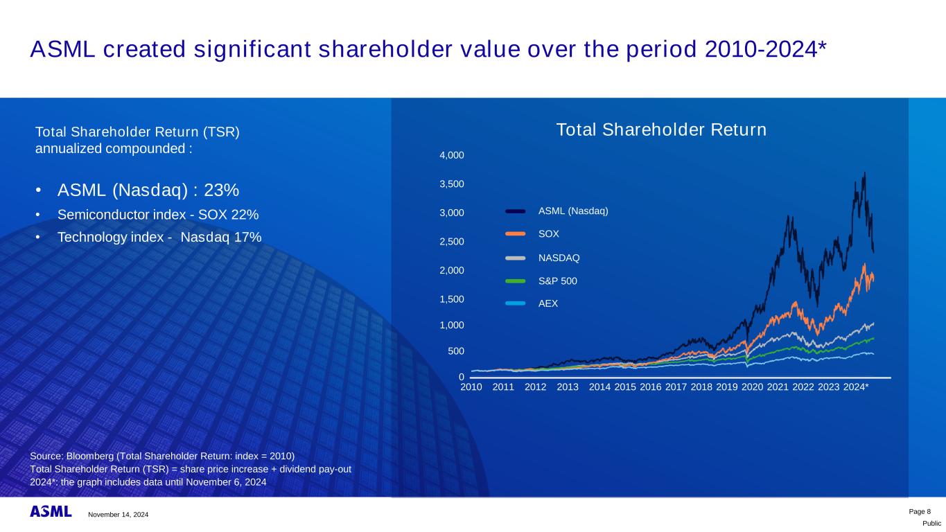 受收入增长、利润率提高和股票回购的推动,Public ASML的EPS自2014年以来以22%的复合年增长率增长Page 7 Systems(十亿欧元)毛利率(%)Installed Base Management(十亿欧元)EPS(欧元)• Systems收入自2014年以来以18%的复合年增长率增长• Installed Base Management*自2014年以来,在不断增长的安装基数的升级和服务的推动下,以14%的复合年增长率增长•毛利率从2014年的44%提高到超过50%,主要是由于EUV盈利能力取得进展,同时其他业务保持强劲的利润率•自2014年以来,在盈利能力和股票回购的推动下,每股收益(EPS)以22%的复合年增长率增长*已安装的基地管理等于我们的网络服务和实地期权销售**2024E是FY24增长驱动因素的中点指引20142015201620172018201920202021202220232024E**4.24.24.66.4 1.6 2.1 2.2 2.75.96.36.89.1 10.9 2.78.31 1.8 2.8 10.3 3.79.01 4.0 18.65.01 3.7 15.45.72 1.25.6 27.6 28.02 1.96.22 1.81 4.14 2.74 3.22 3.46 4.9 36.106.168.49 14.36 19.9 144% 46% 45% 45% 45% 49% 53% 51% 51% 51%收入/毛利率/每股收益2024年11月14日