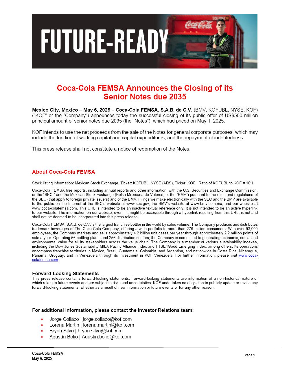 可口可乐凡萨瓶装宣布其2035年到期的优先票据收官——墨西哥墨西哥城– 2025年5月6日– 可口可乐凡萨瓶装 FEMSA,S.A.B. de C.V.(BMV:KOFUBL;NYSE:KOF)(“KOF”或“公司”)今天宣布,其于2035年到期的本金金额为5亿美元的优先票据(“票据”)的公开发售成功收官,其定价已于2025年5月1日。KOF拟将出售票据所得款项净额用于一般公司用途,其中可能包括为营运资金和资本支出提供资金,以及偿还债务。本新闻稿不构成票据赎回通知。关于可口可乐凡萨瓶装股票上市信息:墨西哥证券交易所,代码:KOFUBL、NYSE(ADS),代码:KOF | KOFUBL与KOF的比率= 10:1 TERM0 FEMSA 可口可乐凡萨瓶装根据SEC(适用于外国私人发行人)和BMV的规则和条例向美国证券交易委员会(SEC)或“SEC”和墨西哥证券交易所(Bolsa Mexicana de Valores,或“BMV”)提交报告,包括年度报告和其他信息。我们以电子方式向SEC和BMV提交的文件可在SEC网站www.sec.gov、BMV网站www.bmv.com.mx和我们的网站www.coca-colafemsa.com上的互联网上向公众提供。此URL旨在成为一个非活动的文本引用仅。它不打算成为我们网站的主动超链接。我们网站上的信息,即使可以通过本URL产生的超链接访问,也不会也不应被视为纳入本新闻稿。可口可乐凡萨瓶装,S.A.B. de C.V.是世界上销量最大的特许经营装瓶商。该公司生产和分销The Coca-Cola Company的商标饮料,为超过2.76亿消费者提供广泛的产品组合。该公司拥有超过9.3万名员工,每年通过约220万个销售点营销和销售约42亿个单元箱。该公司运营着56家装瓶厂和256个配送中心,致力于为整个价值链的所有利益相关者创造经济、社会和环境价值。该公司是多个可持续发展指数的成员,包括道琼斯可持续发展MILA太平洋联盟指数和FTSE4Good新兴指数等。该公司的业务包括在墨西哥、巴西、危地马拉、哥伦比亚和阿根廷的特许经营区域,并在哥斯达黎加、尼加拉瓜、巴拿马、乌拉圭和通过其在委内瑞拉的投资在全国范围内开展业务。欲了解更多信息,请访问www.coca-colafemsa.com。前瞻性陈述本新闻稿包含前瞻性陈述。前瞻性陈述是非历史性质的信息,或与未来事件相关的信息,并受到风险和不确定性的影响。无论由于新信息或未来事件或任何其他原因,KOF不承担公开更新或修改任何前瞻性陈述的义务。欲了解更多信息,请联系投资者关系团队:• Jorge Collazo | jorge.collazo@kof.com • Lorena Martin | lorena.martinl@kof.com • Bryan Silva | bryan.silva@kof.com • Agust í n Bolio | agustin.bolio@kof.com