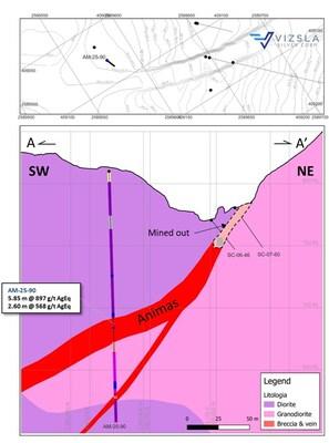 图3:显示Animas结构在深度变平的横截面和发现孔AM-25-90。(CNW Group/Vizsla Silver Corp.)