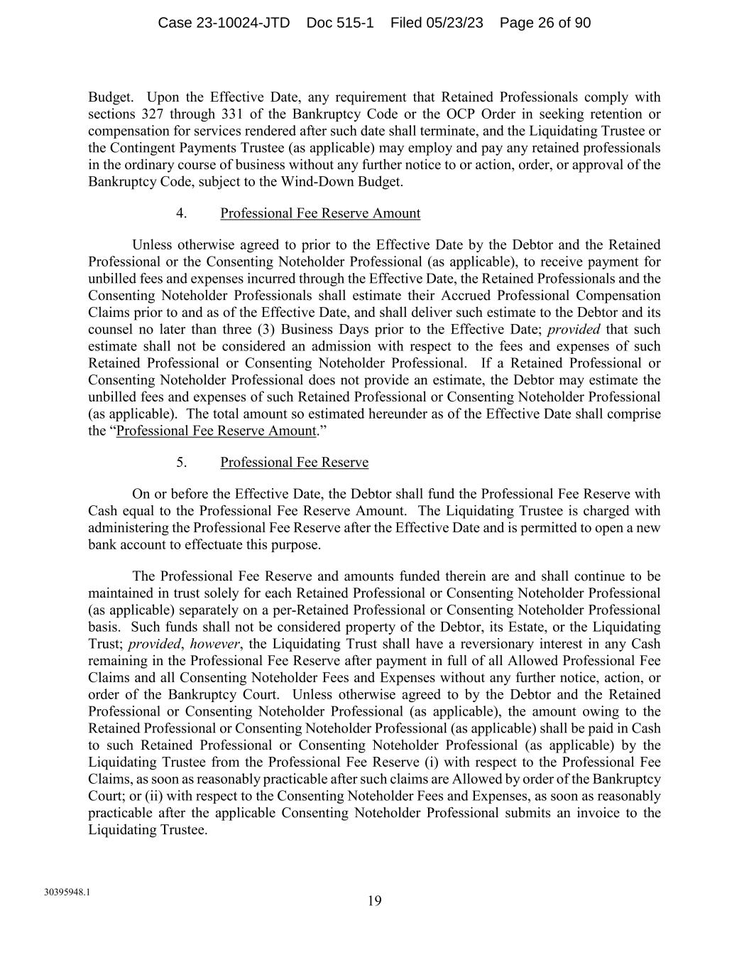 1930395948.1预算。自生效日期起,任何要求留用专业人员遵从《破产法》第327至331条或《破产管理法令》的规定,以寻求留用或补偿在该日期后提供的服务,均须终止,而清盘受托人或或或有付款受托人(如适用)可在正常业务过程中雇用任何留用专业人员并向其支付薪酬,而无须再向《破产法》发出通知或采取行动、命令或批准,但须符合清盘预算。4.专业人员费用储备金额除非债务人和留用专业人员或同意记账的专业人员(视情况而定)在生效日期之前另有约定,否则留用专业人员和同意记账的专业人员应在生效日期之前和生效日期之前估计其应计专业人员报酬要求,并须在生效日期前三(3)个营业日内,将该估计数送交债务人及其大律师;但该估计数不得视为承认该留用专业人员或持同意意见的专业人员的费用及开支。如果留用专业人员或同意记账的专业人员未提供估计数,债务人可估计该留用专业人员或同意记账的专业人员(视情况而定)的未开票费用和开支。截至生效日期,本协议项下的估计总额应包括“专业费用储备额”。5.专业费用储备金在生效日期当日或之前,债务人应以与专业费用储备金金额相等的现金为专业费用储备金提供资金。清盘受托人在生效日期后负责管理专业费用储备金,并获准开设新的银行帐户以实现此目的。专业人员费用储备金和其中供资的数额现在并将继续以信托形式单独为每一名留用专业人员或同意记账员专业人员(如适用)按每一名留用专业人员或同意记账员专业人员的基础保持。此类资金不应被视为债务人、其遗产或清算信托的财产;但清算信托在全额支付所有允许的专业费用索赔和所有同意的记账人费用和开支后,应对专业费用储备金中剩余的任何现金享有复归权益,而无需破产法院的任何进一步通知、诉讼或命令。除非债务人与保留专业人士或同意记账人专业人士(如适用)另有协议,否则清盘受托人须在破产法庭命令准许有关申索后,在合理切实可行范围内,尽快将欠保留专业人士或同意记账人专业人士(如适用)的款项以现金支付予该等保留专业人士或同意记账人专业人士(如适用)的专业费用储备金(i);或(ii)同意记账人费用及开支,在适用的同意记账人专业人士向清盘受托人提交发票后,在合理可行的范围内尽快。判例23-10024-JTD Doc 515-1提交05/23/23第26页,共90页