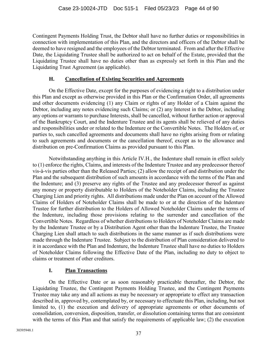 3730395948.1或有付款持有信托,债务人在执行本计划方面不再负有其他义务或责任,债务人的董事和高级职员应被视为已辞职,债务人的雇员已被解雇。自生效日期起及之后,清盘受托人即获授权代表遗产行事,但除本计划及《清盘信托协议》(如适用)明文规定的职责外,清盘受托人并无其他职责。H.现有证券和协议的注销自生效之日起,除为证明根据本计划享有分配权的目的外,以及除本计划或确认令另有规定外,证明(1)任何债权持有人对债务人的任何债权或权利的所有协议和其他文件,包括证明此类债权的任何票据;或(2)债务人的任何权益,包括购买权益的任何期权或认股权证,应予注销,而无需破产法院采取进一步行动或批准,义齿受托人及其代理人应被免除义齿或可转换票据项下或与之相关的任何义务和责任。这些被取消的协议和文件的持有人或当事人不享有因这些协议和文件或取消这些协议和文件而产生或与之有关的任何权利,但根据本计划规定的确认前索偿的津贴和分配除外。尽管本第IVH条另有规定,契约仍应仅在以下方面有效:(1)强制执行契约受托人及其任何前任的权利、债权和利益;(2)允许根据计划收取和分配这些金额,以及随后根据计划和契约的条款分配这些金额;以及(3)保留受托人及其任何前任的任何权利,以对抗可分配给票据持有人债权持有人的任何金钱或财产,包括受托人收取留置权和优先权。根据本计划作出的所有因票据持有人的准许债权而作出的分配,均须向契约受托人作出或在契约受托人的指示下作出,以便根据契约条款,包括与交出和注销可转换票据有关的条款,进一步向准许票据持有人作出分配。不论向票据持有人债权的持有人作出的分配是由契约受托人作出的,还是由契约受托人以外的分配代理人作出的,收取留置权的受托人应以与通过契约受托人作出分配相同的方式附加于该等分配。在按照计划和契约向其交付的计划对价分配的前提下,契约受托人在计划生效日期后对票据持有人债权持有人不承担任何责任,包括不对债权提出异议或对其他债权人的待遇。一、计划交易在生效日期或其后合理可行的时间内,债务人、清算受托人、或有付款受托人及或有付款受托人可采取一切必要或适当的行动,以实施本计划所述、经其批准、预期或为实施本计划所必需的交易,包括但不限于:(1)执行和交付有关合并、转换、处分、转让的适当协议或其他文件,或包含符合本计划条款并符合适用法律要求的条款的解散;(2)执行案23-10024-JTD Doc 515-1提交05/23/23第44页,共90页