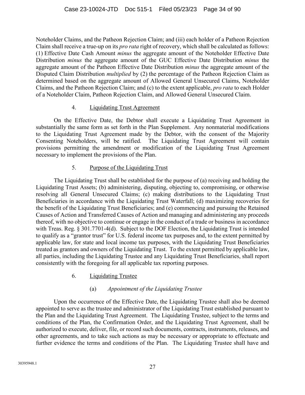 2730395948.1记事人索赔和Patheon驳回索赔;以及(iii)Patheon驳回索赔的每一持有人应收到对其按比例追索权的核实,其计算方法如下:(1)生效日期现金金额减去票据持有人生效日期分配总额减去GUC生效日期分配总额减去Patheon生效日期分配总额减去争议债权分配总额乘以(2)Patheon拒绝债权的百分比,该百分比是根据允许的一般无担保债权、票据持有人债权和Patheon拒绝债权的总额确定的;(c)在适用的范围内,按票据持有人债权、Patheon拒绝债权的每个持有人的比例计算,和允许的一般无担保债权。4.清算信托协议自生效之日起,债务人应以与计划补充文件中规定的基本相同的形式签署清算信托协议。债务人对清算信托协议作出的任何非实质性修改,经多数同意票据持有人同意后,将予以批准。清算信托协议将包含允许修改或修改清算信托协议的条款,以执行计划的条款。5.清算信托的目的清算信托的设立目的是:(a)接收和持有清算信托资产;(b)管理、争议、反对、损害或以其他方式解决所有一般无担保债权;(c)按照清算信托瀑布向清算信托受益人进行分配;(d)为清算信托受益人的利益实现最大限度的追偿;以及(e)启动和执行保留诉讼因由和转移诉讼因由,并管理和管理其任何收益,目的不是按照Treas. Reg. § 301.7701-4(d)继续或从事某项贸易或业务。根据自由度选举的规定,清算信托在美国联邦所得税方面,以及在适用法律允许的范围内,在州和地方所得税方面,应被视为“设保人信托”,清算信托受益人被视为清算信托的设保人和所有者。在适用法律允许的范围内,所有各方,包括清算受托人和任何清算信托受益人,应为所有适用的报税目的,按照上述规定进行一致的报告。6.清算受托人(a)清算受托人的委任于该生效日期发生时,清算受托人亦须被视为获委任为根据本计划及清算信托协议成立的清算信托的受托人及管理人。根据计划、确认令和清算信托协议的条款和条件,清算受托人应被授权执行、交付、归档或记录此类文件、合同、文书、释放和其他协议,并采取必要或适当的行动,以执行计划的条款和条件并进一步证明这些条款和条件。清盘受托人须将及Case 23-10024-JTD Doc 515-1存档05/23/23第34页,共90页