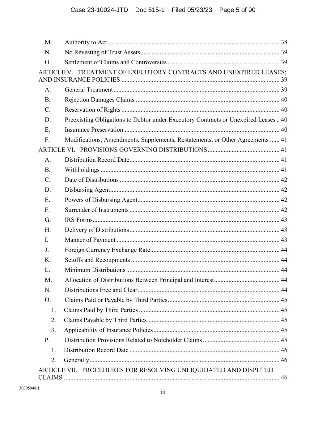 iii 30395948.1M.行为授权.....................................................................................................................38 N.不得撤销信托资产.....................................................................................39 O.债权和争议的解决................................................................................................39条V.执行合同和未到期租赁的处理;以及保险政策.................................................................................................39 A.一般处理......................................................................................39 B.驳回损害索赔......................................................................40 C.保留权利...................................................................................................40 D.根据执行合同或未到期租赁对债务人的既有义务.。40 E.保险保全.......................................................................................................40 F.修改、修正、补充、重述或其他协议.....。41第六条。管理分配的规定.....................................................................41 A.分配记录日期.....................................................................................41 B.扣缴款项.....................................................................................................41 C.分配日期.....................................................................................................42 D.支付代理的权力.....................................................................................................42 F.交出票据.....................................................................................42 G. IRS表格.....................................................................................................................43 H.分配的交付.....................................................................................43 I.支付方式.....................................................................................................43 J.外币汇率.................................................................................................44 K.抵销和补偿.............................................................................................................................44 L.最低分配...............................................................................................................。和明确的.....................................................................................44 O.第三方支付或应付的债权......................................................................451。第三方支付的索赔.....................................................................................................45 2。第三方应付的索赔...................................................................................453。保单的适用性...................................................................................45 P.与票据持有人索赔有关的分配条款......................................................451。分配记录日期......................................................................................46 2。一般说来.....................................................................................................46第七条。解决未清偿及有争议索偿的程序.....................................................................................................................46判例23-10024-JTD Doc 515-1存档05/23/23第5页,共90页