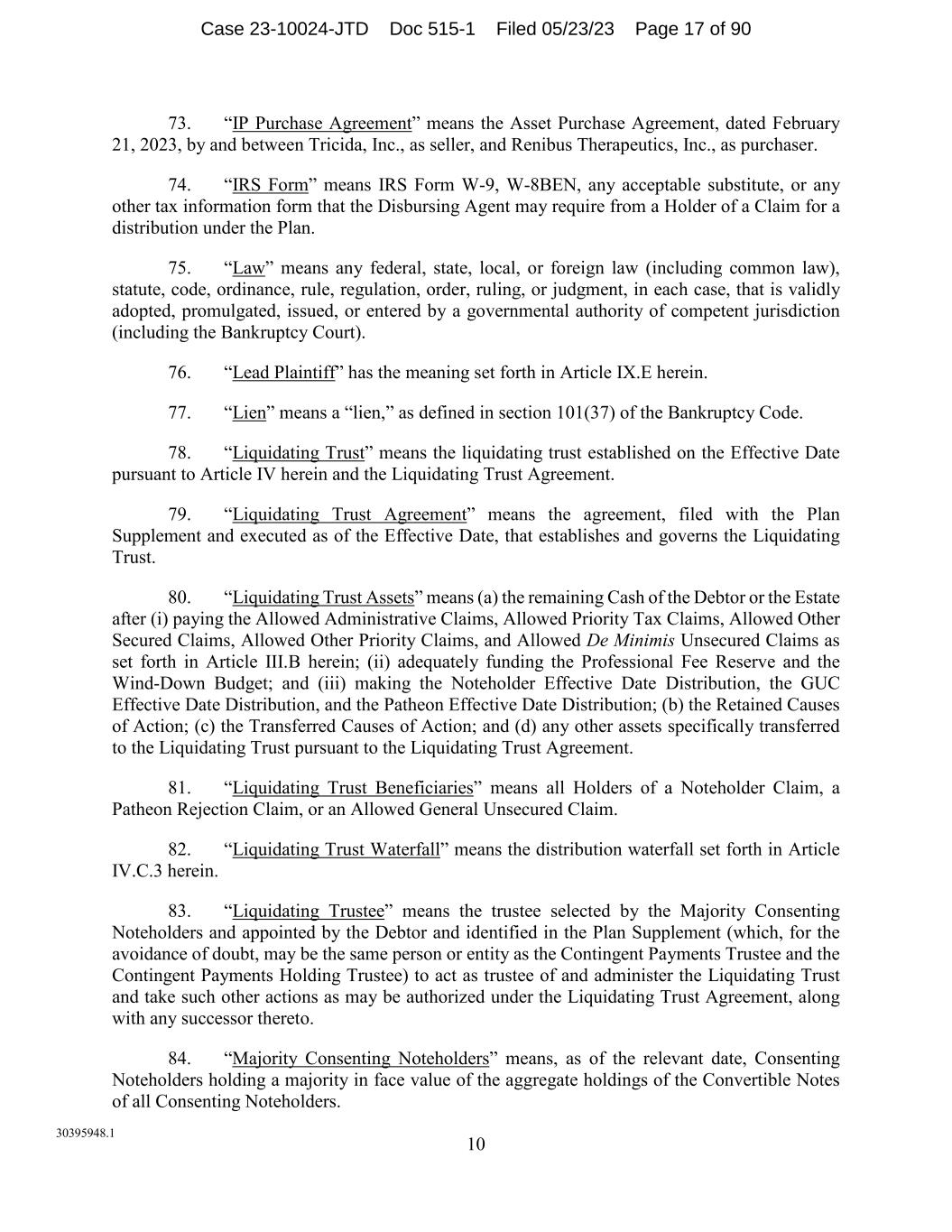 10 30395948.1 73.“知识产权购买协议”是指Tricida, Inc.作为卖方与Renibus Therapeutics公司作为买方于2023年2月21日签署的资产购买协议。74.“IRS表格”是指IRS表格W-9,W-8BEN,任何可接受的替代品,或任何其他税务信息表格,付款代理可能要求索赔持有人根据计划进行分配。75.“法律”是指任何联邦、州、地方或外国法律(包括普通法)、法规、法典、法令、规则、条例、命令、裁决或判决,在每种情况下,由具有管辖权的政府机构(包括破产法院)有效地通过、颁布、发布或录入。76.“主要原告”具有本文第IX.E条所述的含义。77.“留置权”是指《破产法》第101(37)条所定义的“留置权”。78.“清算信托”是指根据本协议第四条和《清算信托协议》在生效日期成立的清算信托。79.“清算信托协议”是指在计划补充文件中提交并自生效之日起执行的建立和管理清算信托的协议。80.“清算信托资产”是指(a)债务人或遗产在(i)支付本条款第III.B条规定的允许的行政债权、允许的优先权税收债权、允许的其他有担保债权、允许的其他优先权债权和允许的最低限度无担保债权之后的剩余现金;(ii)为专业费用准备金和清盘预算提供充足资金;以及(iii)进行票据持有人生效日期分配,GUC生效日期分配,和Patheon生效日期分配;(b)保留的诉讼因由;(c)转让的诉讼因由;(d)根据清算信托协议具体转让给清算信托的任何其他资产。81.“清算信托受益人”是指票据持有人债权、Patheon拒绝债权或允许的一般无担保债权的所有持有人。82.“清算信托瀑布”是指本文第IV.C.3条规定的分配瀑布。83.“清算受托人”是指由多数同意票据持有人选定并由债务人指定并在计划补充文件中指明的受托人(为免生疑问,该受托人可能与或有付款受托人和或有付款持有受托人是同一个人或实体)担任清算信托的受托人并管理清算信托,并采取清算信托协议授权的其他行动,以及清算信托协议的任何继承人。84.“多数同意票据持有人”是指,在相关日期,所有同意票据持有人持有的可转换票据的总持有量中,持有多数面值的同意票据持有人。案件23-10024-JTD Doc 515-1提交05/23/23第17页,共90页