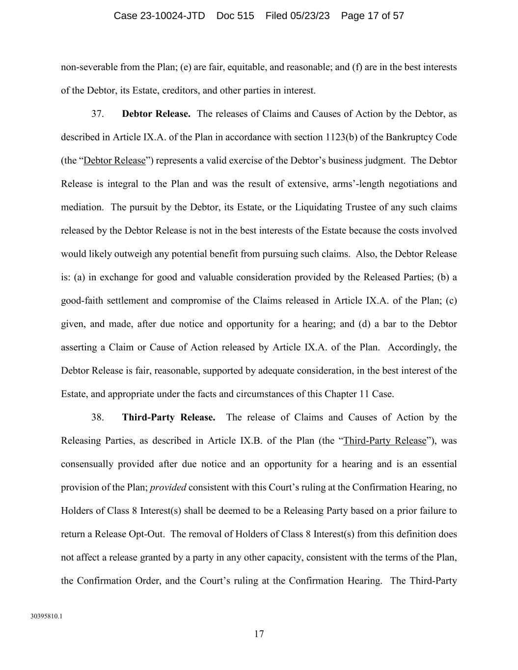 1730395810.1不能与计划分开;(e)公平、公正和合理;(f)符合债务人、其遗产、债权人和其他利益方的最佳利益。37.债务人释放。根据《破产法》第1123(b)节,《计划》第IX.A条所述债务人解除债权和诉讼理由(“债务人解除”)是债务人有效行使商业判断。解除债务人债务是该计划不可或缺的一部分,是广泛的、公平的谈判和调解的结果。债务人、其遗产或清算受托人追索债务人解除的任何此种债权不符合遗产的最佳利益,因为所涉费用可能超过追索此种债权的任何潜在利益。此外,债务人解除义务是:(a)以被解除义务的当事方提供的良好和有价值的考虑作为交换;(b)善意解决和妥协《计划》第IX.A条解除义务的债权;(c)在适当通知和听证机会之后给予并作出;(d)禁止债务人主张《计划》第IX.A条解除义务的债权或诉讼理由。因此,免除债务人是公平、合理的,有充分的考虑作为支持,符合破产财产的最佳利益,并且在本第11章案件的事实和情况下是适当的。38.第三方发布。如计划第IX.B条(“第三方解除”)所述,解除当事方的索赔和诉讼理由的解除是在适当通知和听证机会之后经双方同意提供的,是计划的一项基本规定;如果与本法院在确认听证会上的裁决一致,第8类权益的任何持有人均不应被视为基于先前未能返还解除选择退出的解除当事方。将第8类权益持有人从这一定义中除名并不影响一方以任何其他身份根据计划、确认令和法院在确认聆讯中的裁决所给予的释放。第三方案件23-10024-JTD Doc 515提交05/23/23第17页,共57页