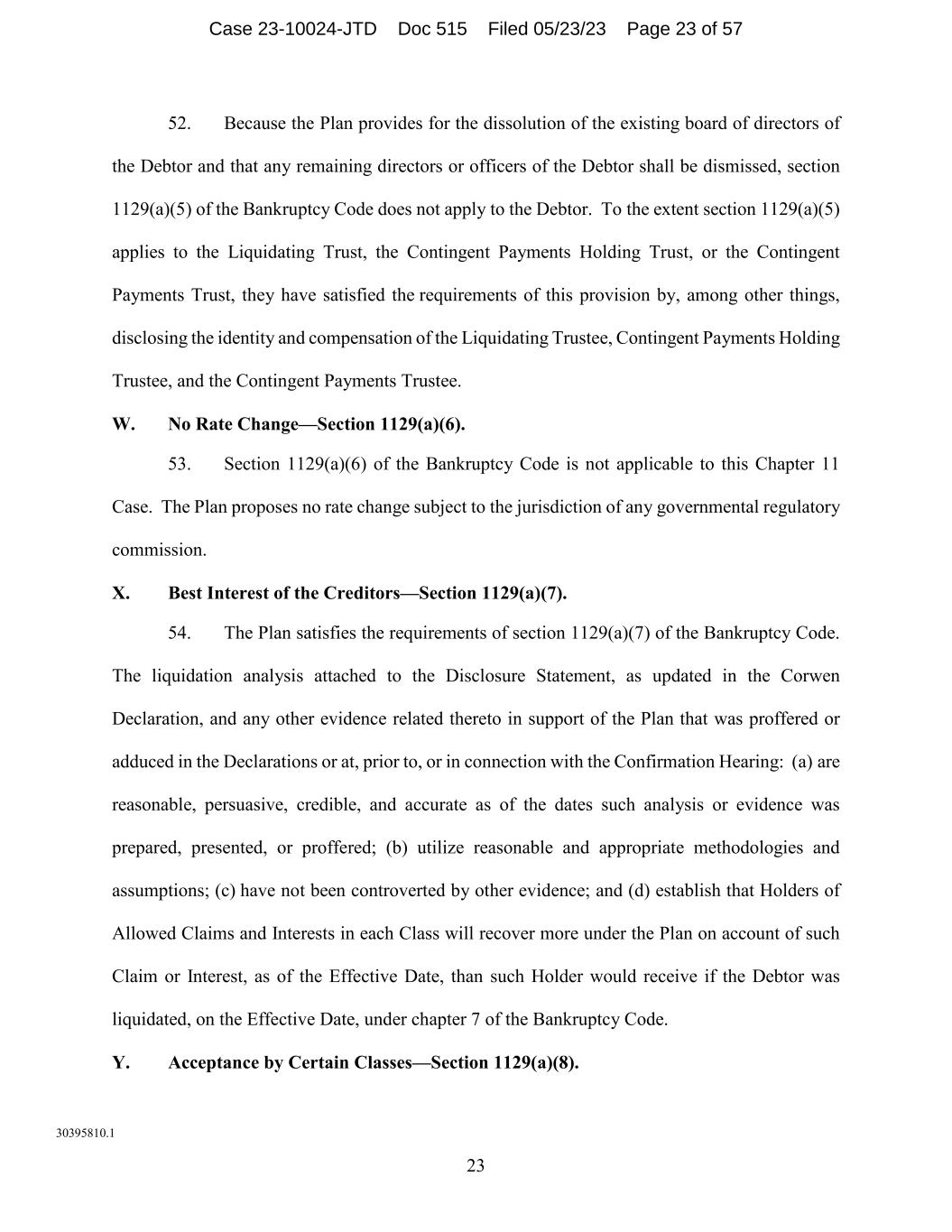 23 30395810.1 52.由于《计划》规定解散债务人的现有董事会,并且债务人的任何剩余董事或高级职员应被解职,因此《破产法》第1129(a)(5)条不适用于债务人。在第1129(a)(5)条适用于清算信托、或有付款持有信托或或有付款信托的范围内,它们通过披露清算受托人、或有付款持有受托人和或有付款受托人的身份和补偿等方式满足了本条款的要求。W.不变动率——第1129(a)节(6)。53.《破产法》第1129(a)(6)条不适用于第11章案件。该计划建议,在任何政府管理委员会管辖的情况下,不改变费率。十、债权人的最佳利益——第1129(a)(7)条。54.该计划符合《破产法》第1129(a)(7)条的规定。在《Corwen声明》中更新的《披露声明》所附的清算分析,以及在声明中或在确认听证会之前或与确认听证会相关的为支持该计划而提供或援引的任何其他证据:(a)在此类分析或证据编制、提交之日是合理的、有说服力的、可信的和准确的,(b)运用合理和适当的方法和假设;(c)没有被其他证据反驳;(d)确定每个类别的允许债权和权益持有人在生效日期根据该计划因该债权或权益而获得的赔偿,将超过该持有人在生效日期根据《破产法》第7章清算债务人时获得的赔偿。Y.某些阶层的接受——第1129(a)(8)节。判例23-10024-JTD Doc 515提交05/23/23第23页,共57页