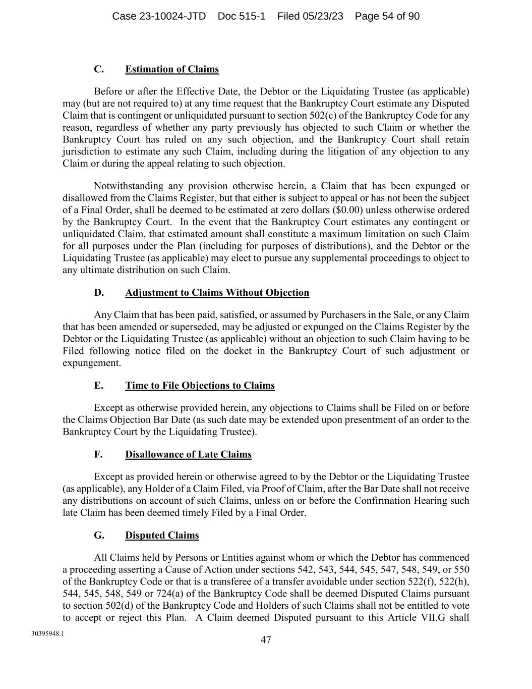 4730395948.1C.债权的估计在生效日期之前或之后,债务人或清算受托人(如适用)可随时(但无须)要求破产法院根据《破产法》第502(c)条以任何理由估计任何有争议或未清算的债权,而不论任何一方先前是否反对该债权,或破产法院是否已就任何该等反对作出裁决,破产法院应保留对任何该等债权进行估计的管辖权,包括在对任何申索提出反对的诉讼期间,或在就该反对提出上诉期间。尽管本条例另有规定,除非破产法院另有命令,否则已从索赔登记册上删除或不允许的索赔,但可上诉或不是最后命令的主题的索赔,应视为估计为零美元(0.00美元)。如果破产法院对任何或有或未清偿债权作出估计,该估计数额应构成该债权在本计划下所有用途(包括分配用途)的最高限额,债务人或清算受托人(如适用)可选择进行任何补充程序,以反对对该债权的任何最终分配。D.无异议对债权的调整买方在出售过程中已支付、满足或承担的任何债权,或任何已被修改或取代的债权,可由债务人或清算受托人(视情况而定)在债权登记册上进行调整或删除,而无须对此种债权提出异议,必须在向破产法院提交有关调整或删除的案卷通知后提交。对债权提出异议的时间除本文另有规定外,对债权的任何异议均应在债权提出异议之日或之前提出(该日期可在清算受托人向破产法院出示命令时延长)。F.不容许逾期索偿,除非本条文另有规定,或债务人或清盘受托人(视情况而定)另有协议,否则任何在禁售日期后透过索偿证明提出的索偿的持有人,不得因该等索偿而获得任何分派,除非在聆讯确认书当日或之前,该等逾期索偿已被视为及时以最终命令提出。G.有争议的债权债务人已根据《破产法》第542、543、544、545、547、548、549或550条启动诉讼程序的个人或实体,或根据《破产法》第522(f)、522(h)、544、545、548、549或724(a)条可予撤销的转让的受让人所持有的所有债权,应根据《破产法》第502(d)条被视为有争议的债权,此类债权的持有人无权投票接受或否决本计划。根据本条被视为有争议的索赔VII.G应将案件23-10024-JTD Doc 515-1提交05/23/23第54页,共90页