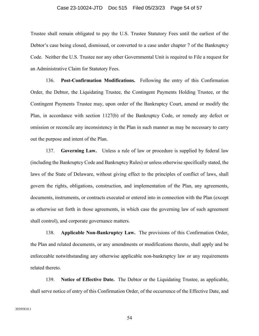 5430395810.1受托人仍有义务向美国受托人支付法定费用,直至债务人的案件最早结案、被驳回或根据《破产法》第7章转为案件。美国受托人或任何其他政府单位都无须就法定费用提出行政索赔请求。136.确认后的修改。在本确认令生效后,债务人、清算受托人、或有付款受托人或或有付款受托人可根据破产法院的命令,根据《破产法》第1127(b)条修订或修改计划,或以执行计划的目的和意图所需的方式补救计划中的任何缺陷或遗漏,或调和计划中的任何不一致之处。137.管辖法律。除非联邦法律(包括《破产法》和《破产规则》)规定了法律规则或程序,或者除非另有具体说明,否则在不影响法律冲突原则的情况下,特拉华州的法律应管辖本计划、与本计划有关的任何协议、文件、文书或合同的权利、义务、构造和实施(除非这些协议中另有规定,在这种情况下,此种协议的管辖法律应加以控制)以及公司治理事项。138.适用的非破产法。本确认令、本计划及有关文件的条文,或其任何修订或变通,均适用并可强制执行,即使任何其他方面适用的非破产法或与此有关的任何规定亦不例外。139.生效日期通知。债务人或清算受托人(如适用)应将本确认令的记录、生效日期的发生和案件23-10024-JTD Doc 515的发生通知送达提交人05/23/23第54页,共57页