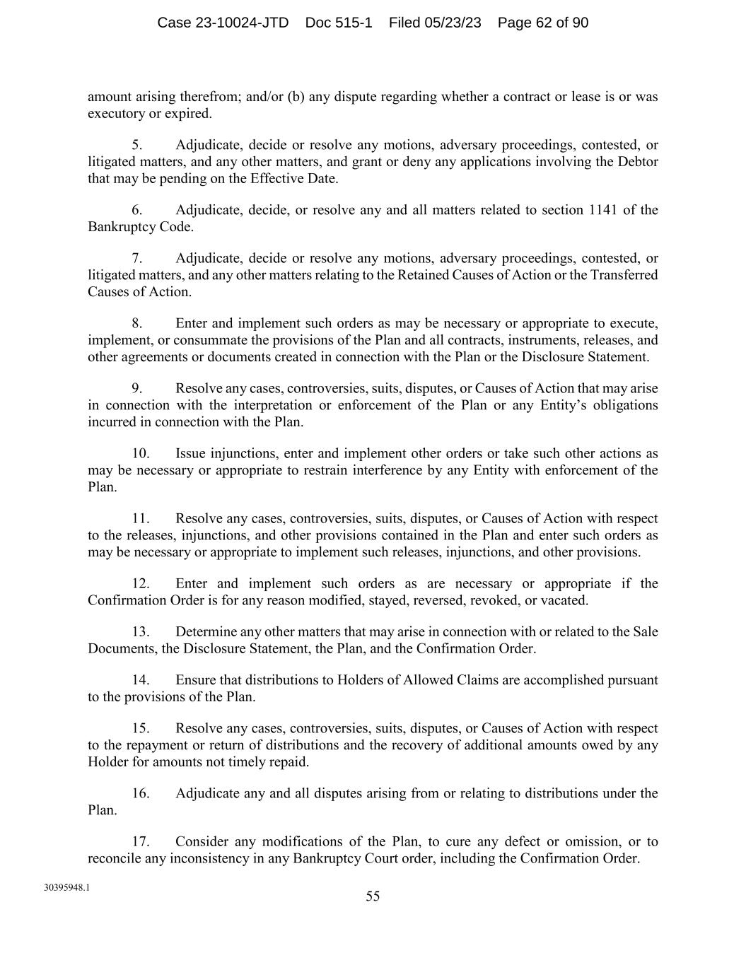 5530395948.1由此产生的金额;和/或(b)关于合同或租约是否已执行或已到期的任何争议。5.裁定、决定或解决任何动议、对抗程序、有争议事项或诉讼事项及任何其他事项,并批准或拒绝在生效日期可能待决的涉及债务人的任何申请。6.裁定、决定或解决与《破产法》第1141条有关的任何和所有事项。7.裁定、决定或解决任何动议、对抗程序、有争议或诉讼事项,以及与保留的诉讼因由或移交的诉讼因由有关的任何其他事项。8.输入和执行必要或适当的命令,以执行、执行或完善计划的规定以及与计划或披露声明有关的所有合同、文书、发布和其他协议或文件。9.解决在解释或执行《计划》或任何实体因《计划》而承担的义务方面可能出现的任何案件、争议、诉讼、争端或诉讼理由。10.发布禁令,下达和执行其他命令,或采取必要或适当的其他行动,以限制任何实体干预计划的执行。11.解决与释放、禁令和《计划》所载其他规定有关的任何案件、争议、诉讼、争端或诉讼理由,并输入必要或适当的命令,以执行这些释放、禁令和其他规定。12.输入和执行必要或适当的命令,如果确认令因任何原因被修改、中止、撤销、撤销或撤销。13.决定与销售文件、披露声明、计划及确认令有关或与之有关的任何其他事宜。14.确保按照《计划》的规定完成对允许索赔人的分配。15.解决任何案件、争议、诉讼、争端或诉讼因由,涉及偿还或返还分配款项以及追回任何持有人因未及时偿还的款项而欠下的额外款项。16.裁定因计划下的分配而产生或与之有关的任何及所有争议。17.考虑计划的任何修改,以纠正任何缺陷或遗漏,或调和任何破产法院命令,包括确认令中的任何不一致之处。判例23-10024-JTD Doc 515-1提交05/23/23第62页,共90页