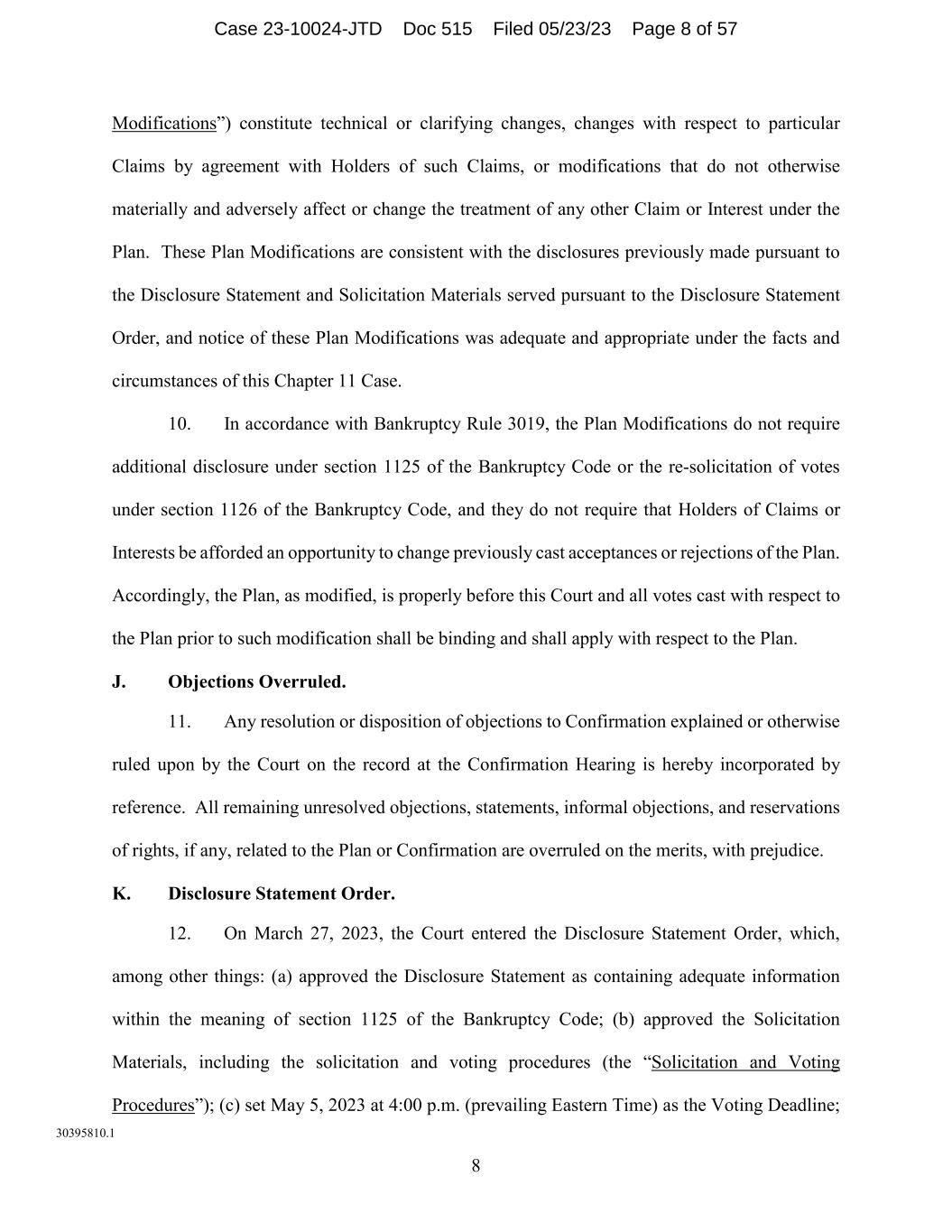 830395810.1修改")构成技术上或澄清上的修改、与此种索赔持有人达成协议而对特定索赔作出的修改或不会对本计划下任何其他索赔或利息的处理产生重大不利影响或改变的修改。这些计划修改与先前根据披露声明和根据披露声明令送达的征集材料所作的披露是一致的,根据第11章案件的事实和情况,这些计划修改的通知是充分和适当的。10.根据《破产法》第3019条,计划修改不要求根据《破产法》第1125条进行额外披露,也不要求根据《破产法》第1126条重新征集投票,也不要求债权或权益持有人有机会改变先前对计划的接受或拒绝。因此,经修订的《计划》已妥善提交本法院,在此种修订之前就《计划》所投的所有票均具有约束力,并应适用于《计划》。J.反对意见被推翻。11.本法院在确认聆讯的纪录上所解释或以其他方式裁定的对确认的反对的任何决议或处置,现以提述方式并入。与《计划》或《确认书》有关的所有未解决的反对意见、声明、非正式反对意见和权利保留,如有任何保留意见,则在有偏见的情况下,根据是非曲直推翻。K.披露声明令。12.2023年3月27日,法院下达了披露声明令,其中包括:(a)批准披露声明包含《破产法》第1125条含义内的充分信息;(b)批准征集材料,包括征集和投票程序(“征集和投票程序”);(c)将2023年5月5日下午4:00(美国东部时间)定为投票截止日期;案件23-10024-JTD Doc 515提交05/23/23第8页,共57页