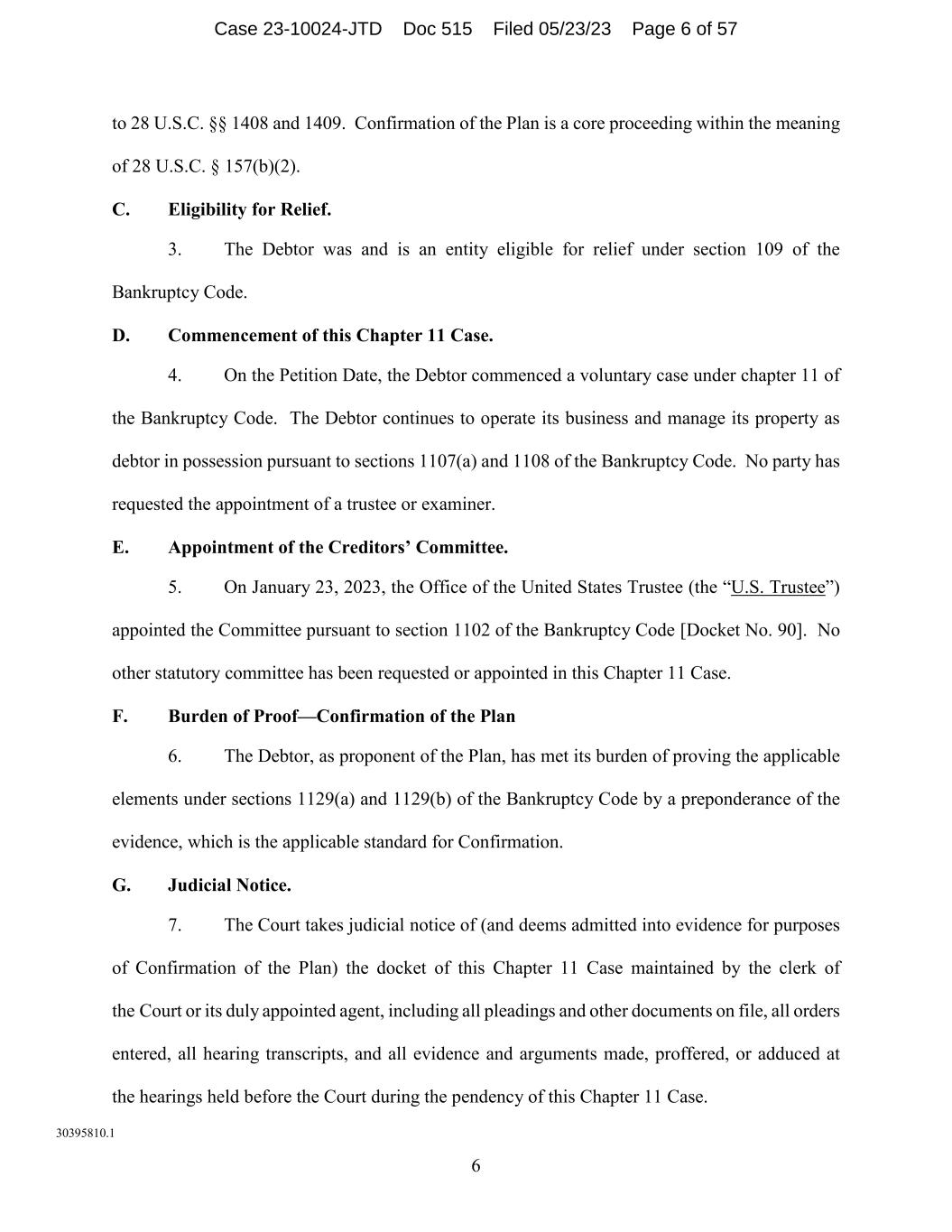 630395810.1至28 U.S.C. § § 1408和1409。确认该计划是28 U.S.C. § 157(b)(2)所指的核心程序。C.救济的资格。3.债务人过去和现在都是根据《破产法》第109条有资格获得救济的实体。D.第11章案件的开始。4.在申请日,债务人根据《破产法》第11章启动了一项自愿案件。根据《破产法》第1107(a)和1108条,债务人继续作为债务人经营其业务和管理其财产。没有任何一方要求指定受托人或审查员。E.任命债权人委员会。5.2023年1月23日,美国受托人办公室(简称“美国受托人”)根据《破产法》第1102条[第90号案卷]任命了该委员会。在本第11章案件中,并无任何其他法定委员会获要求或委任。F.举证责任——确认计划6。债务人作为《计划》的提出者,已经履行了证明《破产法》第1129(a)和1129(b)条所规定的适用要素的责任,证明的证据占多数,这是确认的适用标准。G.司法通知。7.法院将法院书记官或其正式委任的代理人备存的第11章案件的案卷,包括所有书状及其他存档文件、所有输入的命令、所有聆讯笔录,以及在第11章案件待决期间在法院举行的聆讯中提出、提出或引证的所有证据及论点,接获司法通知(并视为为确认本计划的目的而接纳为证据)。判例23-10024-JTD Doc 515提交05/23/23第6页,共57页
