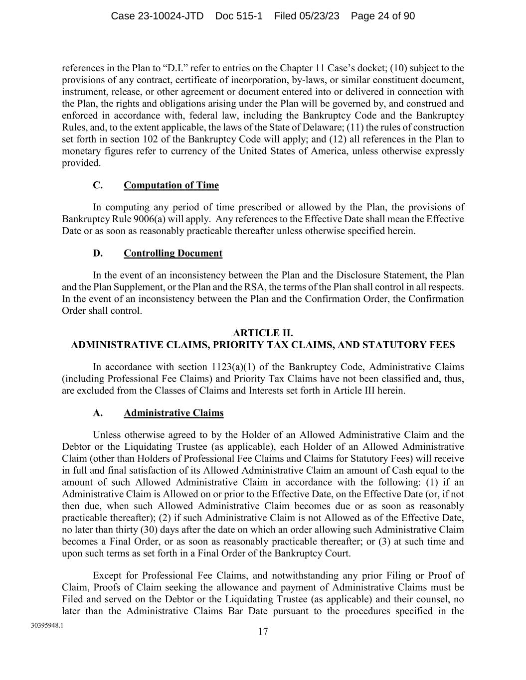 1730395948.1《计划》中提及的“D.I.”指的是第11章案件的案卷上的条目;(10)根据与《计划》订立或交付的任何合同、公司注册证书、细则或类似的组成文件、文书、释放或其他协议或文件的规定,《计划》下产生的权利和义务将受联邦法律(包括《破产法》和《破产规则》)管辖,并根据这些法律加以解释和执行,并在适用的范围内,特拉华州的法律;(11)《破产法》第102条中规定的构造规则将适用;(12)计划中所有提到货币数字的地方都是指美利坚合众国的货币,除非另有明确规定。在计算本计划所订明或容许的任何期间时,将适用破产规则第9006(a)条的条文。任何对生效日期的提述均指该生效日期,或在合理可行的情况下尽快如此,除非本文另有规定。D.控制文件如果《计划》与《披露说明》、《计划》与《补充计划》或《计划》与《区域服务协定》不一致,则《计划》的条款应在所有方面加以控制。如果计划与确认令不一致,确认令应予以控制。第二条。行政债权、优先税收债权和法定费用根据《破产法》第1123(a)(1)条,行政债权(包括专业费用债权)和优先税收债权没有被分类,因此被排除在本文第三条规定的债权和权益类别之外。除非允许的行政索赔持有人和债务人或清算受托人(视情况而定)另有约定,允许的行政索赔的每一持有人(专业费用索赔和法定费用索赔的持有人除外)将按照以下规定获得与允许的行政索赔数额相等的现金全额和最终清偿:(1)如果在生效日期或之前允许的行政索赔,在生效日期(或者,如果未到期,(2)如该等经准许的行政申索自生效日期起不获准许,则不迟于准许该等行政申索的命令成为最终命令的日期后三十(30)天,或在其后合理切实可行的范围内尽快;或(3)在破产法院的最终命令所载的时间及条款下。除专业费用索偿外,尽管有任何事先提交或索偿证明,要求行政索偿的津贴和付款的索偿证明必须提交,并按照案件23-10024-JTD Doc 515-1中规定的程序在不迟于行政索偿截止日期送达债务人或清算受托人(如适用)及其律师。提交05/23/23第24页,共90页