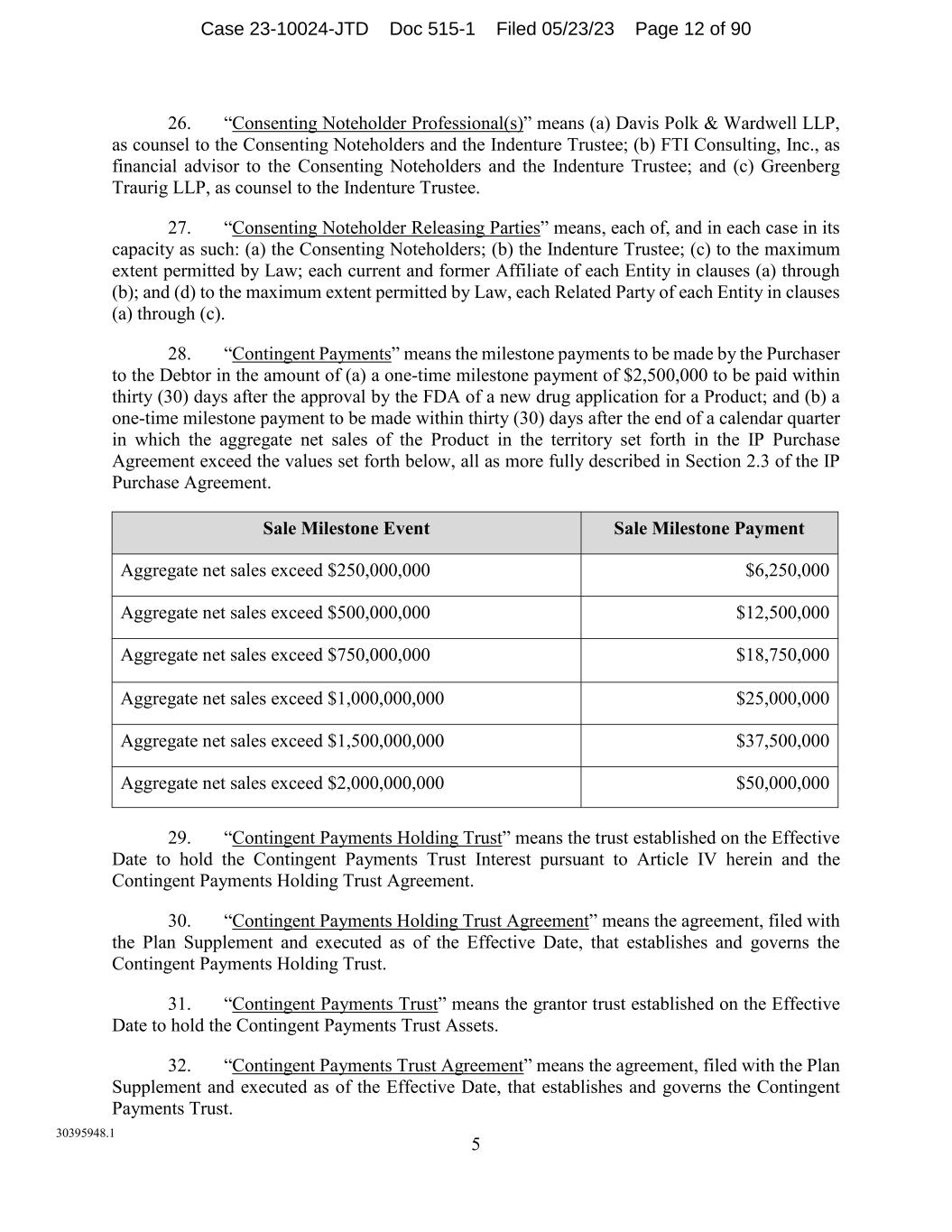 5 30395948.1 26.“Professional Consenting Noteholder(s)”是指(a)Davis Polk & Wardwell LLP,作为Consenting Noteholders和Indenture Trustee的法律顾问;(b)FTI咨询公司,作为Consenting Noteholders和Indenture Trustee的财务顾问;(c)Greenberg Traurig LLP,作为Indenture Trustee的法律顾问。27.“同意票据持有人解除担保方”是指(a)同意票据持有人;(b)契约受托人;(c)在法律允许的最大限度内;(a)至(b)条中每个实体的现有和以前的附属机构;(d)在法律允许的最大限度内,在(a)至(c)条中每个实体的每个关联方。28.“或有付款”是指买方向债务人支付的里程碑付款,金额为:(a)一次性里程碑付款2,500,000美元,在FDA批准一项产品的新药申请后三十(30)天内支付;(b)一次性里程碑付款,在知识产权购买协议所列地区的产品净销售总额超过下述数值的一个日历季度结束后三十(30)天内支付,所有这些都在《知识产权购买协议》第2.3节中有更全面的描述。销售里程碑活动销售里程碑付款合计净销售额超过250,000,000美元6,250,000美元合计净销售额超过500,000,000美元12,500,000美元合计净销售额超过750,000,000美元18,750,000美元合计净销售额超过1,000,000,000美元25,000,000美元合计净销售额超过1,500,000,000美元37,500,000美元合计净销售额超过2,000,000,000美元50,000,000美元29。“或有付款持有信托”是指根据本协议第四条和《或有付款持有信托协议》于生效日期设立的、持有或有付款信托权益的信托。30.“或有付款持有信托协议”是指在计划补充文件中提交并自生效之日起执行的建立和管理“或有付款持有信托”的协议。31.“或有付款信托”是指在生效日期为持有或有付款信托资产而设立的设保人信托。32.“或有付款信托协议”是指在计划补充文件中提交并自生效之日起执行的建立或有付款信托的协议。判例23-10024-JTD Doc 515-1提交05/23/23第12页,共90页