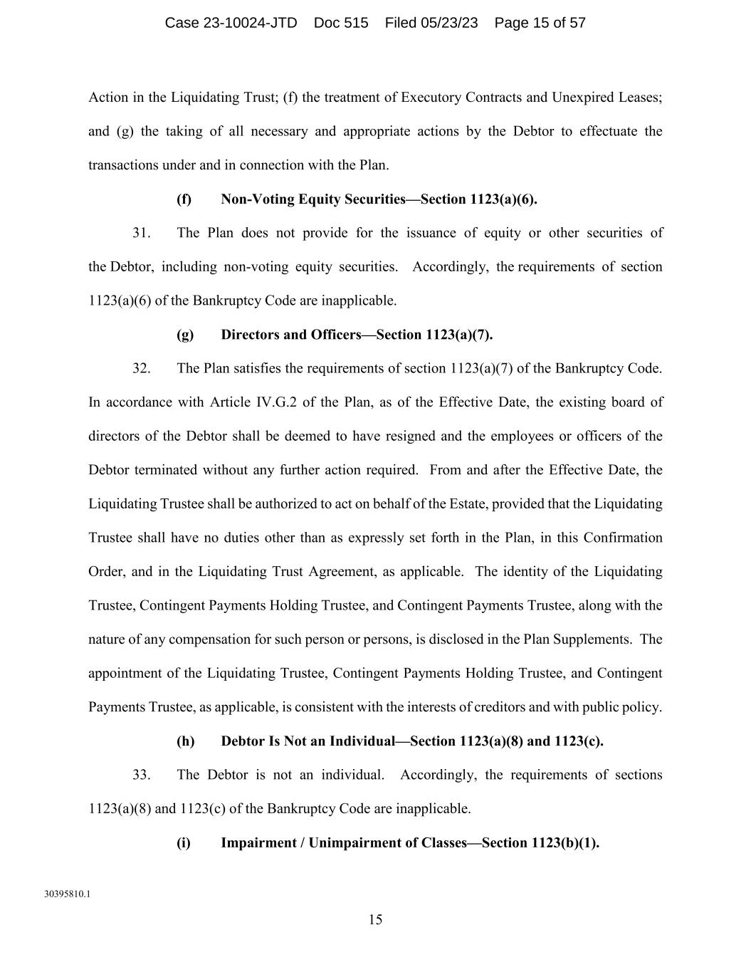 1530395810.1清算信托中的行动;(f)执行合同和未到期租约的处理;(g)债务人采取一切必要和适当的行动,以完成计划下和与计划有关的交易。(f)无表决权股权证券——第1123(a)(6)条。31.该计划没有规定发行债务人的股票或其他证券,包括无表决权的股票证券。因此,《破产法》第1123(a)(6)条的要求不适用。(g)董事和高级职员——第1123(a)(7)条。32.该计划符合《破产法》第1123(a)(7)条的规定。根据《计划》第IV.G.2条,自生效之日起,债务人的现有董事会应被视为已辞职,债务人的雇员或高级职员已被解雇,无需采取任何进一步行动。自生效日期起及之后,清算受托人即获授权代表遗产行事,但清算受托人除在本计划、本确认令及清算信托协议(如适用)中明文规定的职责外,并无其他职责。清算受托人、或有付款持有受托人和或有付款受托人的身份,以及对这些人的任何补偿的性质,均在计划补充文件中披露。清算受托人、或有付款持有受托人和或有付款受托人的任命(如适用)符合债权人的利益和公共政策。(h)债务人不是个人——第1123(a)(8)和1123(c)条。33.债务人不是个人。因此,《破产法》第1123(a)(8)和1123(c)条的要求不适用。(i)班级减值/未减值——第1123(b)(1)节。判例23-10024-JTD Doc 515提交05/23/23第15页