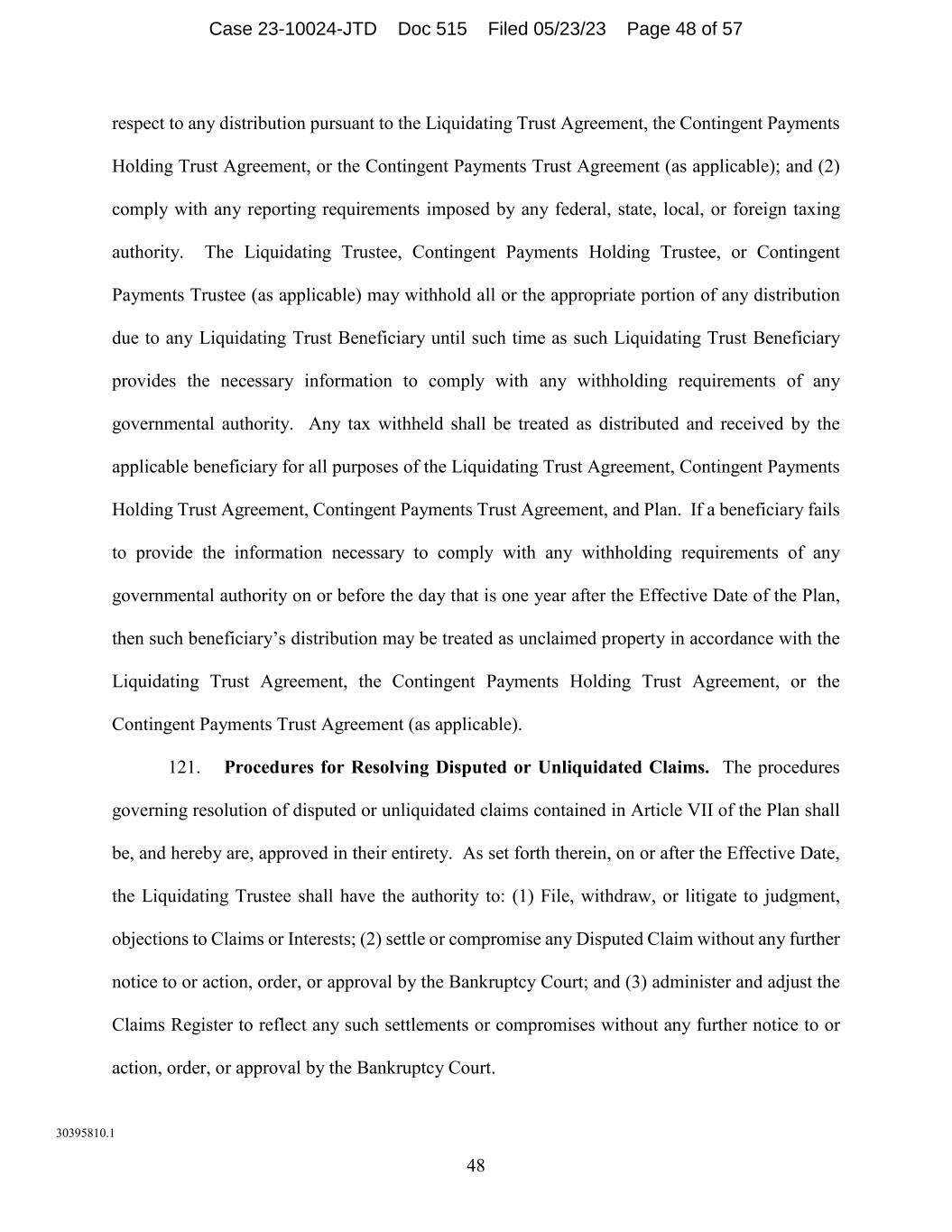 48303958 10.1关于根据《清算信托协议》、《或有付款持有信托协议》或《或有付款信托协议》(如适用)进行的任何分配;(2)遵守任何联邦、州、地方或外国税务机关规定的任何报告要求。清算受托人、或有付款受托人或或有付款受托人(如适用)可扣留应付给清算信托受益人的任何分配的全部或适当部分,直至清算信托受益人提供必要信息以遵守任何政府机构的任何扣缴要求为止。为清算信托协议、或有付款持有信托协议、或有付款信托协议和计划的所有目的,任何预扣的税款应被视为由适用的受益人分配和收取。如果受益人未能在计划生效日期一年后的当天或之前提供遵守任何政府当局的任何扣缴要求所需的信息,则根据《清算信托协议》、《或有付款持有信托协议》或《或有付款信托协议》(视情况而定),该受益人的分配可被视为无人认领的财产。121.解决有争议或未清偿债权的程序。本计划第七条所载的关于解决有争议或未清偿债权的程序应得到批准,并在此得到全部批准。如其中所述,在生效日期当日或之后,清算受托人有权:(1)对债权或权益提出异议、撤回异议或就判决提起诉讼;(2)解决或妥协任何有争议的债权,而无需向破产法院发出任何进一步通知或采取行动、命令或批准;(3)管理和调整债权登记册,以反映任何此类和解或妥协,而无需向破产法院发出任何进一步通知或采取行动、命令或获得破产法院的批准。判例23-10024-JTD Doc 515提交05/23/23第48页,共57页