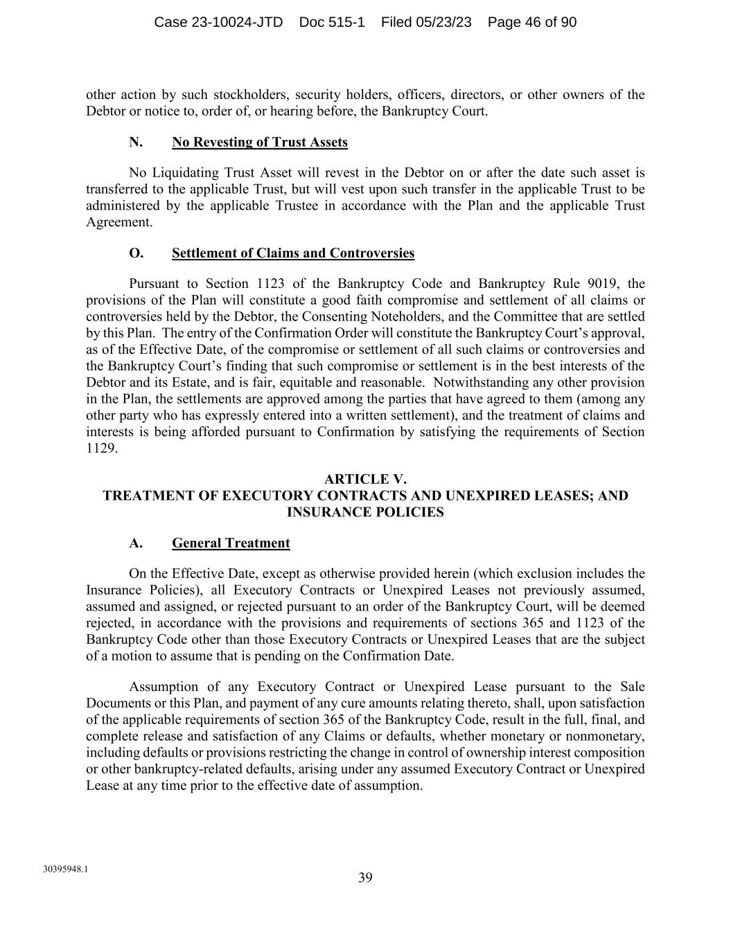 3930395948.1债务人的股东、证券持有人、高级管理人员、董事或其他所有人提起的其他诉讼或向破产法院发出的通知、命令或听讯。不收回信托资产任何清算信托资产将在该资产转让给适用信托之日或之后归还债务人,但将在该资产转让时归还给适用信托,由适用的受托人根据本计划和适用的信托协议管理。O.债权和争议的解决根据《破产法》第1123条和《破产规则》第9019条,本计划的规定将构成对债务人、同意的债权人和委员会提出的所有债权或争议的善意妥协和解决,这些债权或争议均由本计划解决。确认令的加入将构成破产法院自生效之日起批准所有此类索赔或争议的妥协或解决,以及破产法院裁定此类妥协或解决符合债务人及其遗产的最佳利益,并且是公平、公平和合理的。尽管《计划》中有任何其他规定,但和解是在已同意和解的各方(在已明确订立书面和解的任何其他方)之间批准的,根据《确认书》,通过满足第1129条的要求来处理索赔和利益。第五条.执行合同和未到期租赁的处理;以及保险政策A.一般处理在生效日期,除本合同另有规定外(不包括保险单),根据《破产法》第365条和第1123条的规定和要求,所有先前未承担、承担和转让的执行合同或未到期租赁,或根据破产法院的命令被拒绝的执行合同或未到期租赁,将被视为被拒绝,但在确认日期仍未生效的执行合同或未到期租赁除外。根据销售文件或本计划承担任何执行合同或未到期租约,并支付与之相关的任何补救金额,在满足《破产法》第365条的适用要求后,应导致在承担生效日期之前的任何时间,根据任何假定的执行合同或未到期租约产生的任何债权或违约,无论是金钱的还是非金钱的,包括违约或限制所有权权益组成控制权变更的条款或其他与破产有关的违约,全部、最终和完全解除和清偿。案件23-10024-JTD Doc 515-1提交05/23/23第46页,共90页
