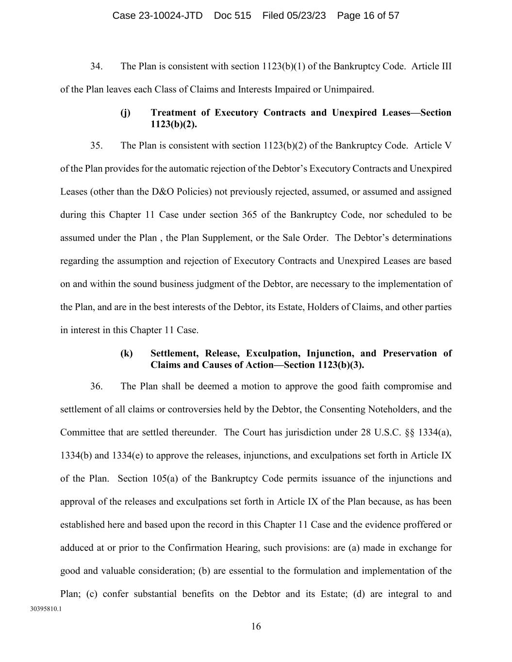16 30395810.1 34.该计划符合《破产法》第1123(b)(1)条。该计划第三条规定,每一类债权和权益不受损害或不受损害。(j)执行合同和未到期租约的处理——第1123(b)(2)条。35.该计划符合《破产法》第1123(b)(2)条。该计划第五条规定,自动拒绝债务人的执行合同和未到期租约(D & O保单除外),这些合同和未到期租约以前没有根据《破产法》第365条在本第11章案件期间被拒绝、假定或假定和转让,也没有根据该计划、计划补充或销售指令预定假定。债务人关于承担和拒绝执行合同和未到期租约的决定是基于并在债务人的合理商业判断范围内作出的,是实施该计划所必需的,并且符合债务人、其财产、债权持有人以及在本第11章案件中的其他利益方的最佳利益。(k)索赔和诉讼理由的解决、释放、免除、强制执行和保全——第1123(b)(3)节。36.本计划应被视为一项动议,要求核准对债务人、同意记事人和委员会提出的根据本计划解决的所有索赔或争议作出善意妥协和解决。根据28 U.S.C. § § 1334(a)、1334(b)和1334(e),法院有权批准《计划》第九条规定的释放、禁令和开脱罪责。《破产法》第105(a)条允许发出禁制令和批准计划第九条所列的释放和开脱,因为正如在此确立的那样,并根据第11章案件的记录以及在确认听证会上或之前提出或援引的证据,这些规定:(a)是为换取良好和有价值的考虑而作出的;(b)是制订和执行计划所必需的;(c)为债务人及其遗产带来重大利益;(d)是案件23-10024-JTD Doc 515的组成部分