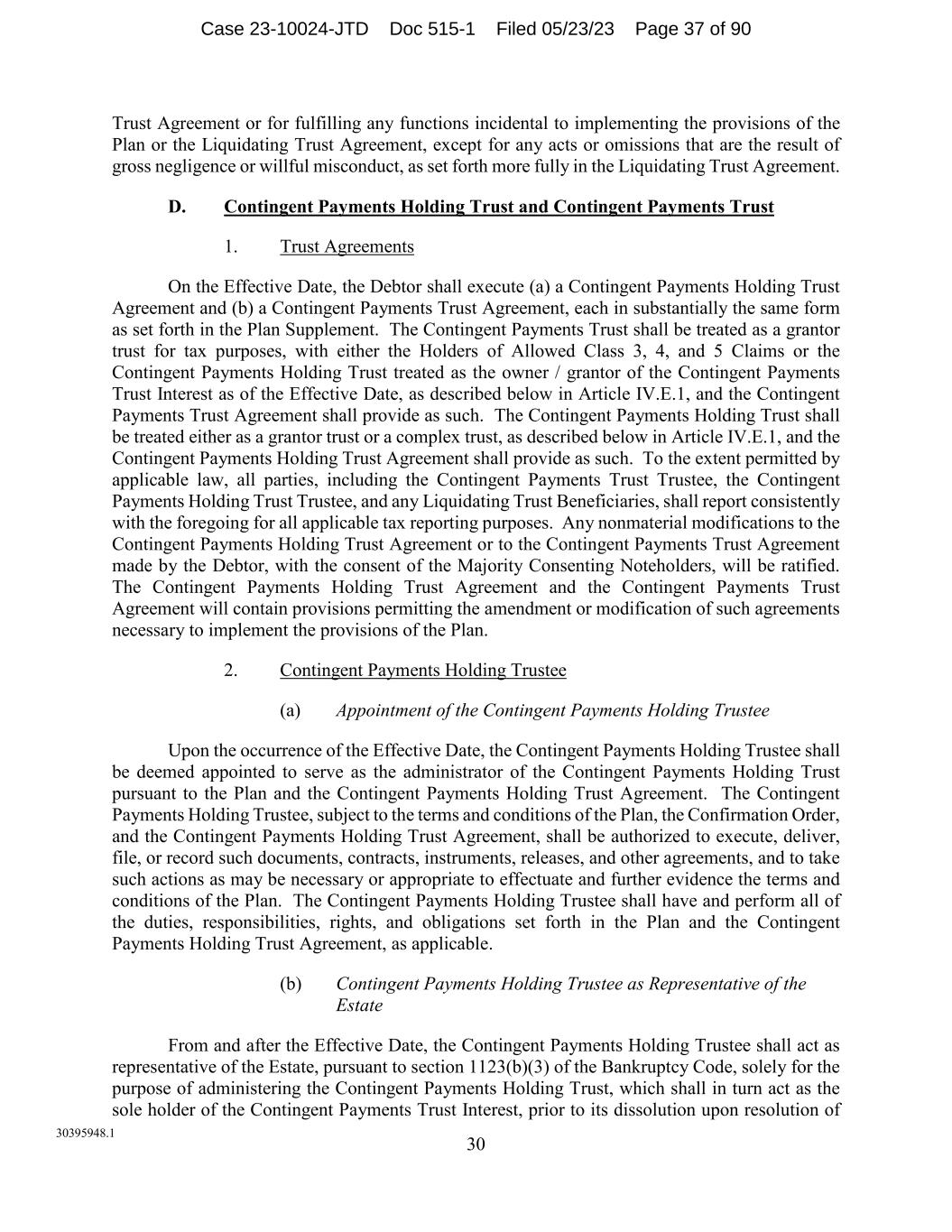 3030395948.1信托协议或履行与执行本计划或清算信托协议的规定有关的任何附带职能,但因重大过失或故意不当行为而产生的任何作为或不作为除外,如清算信托协议中更充分规定的那样。D.持有信托的或有付款和或有付款信托1。信托协议自生效之日起,债务人应签署(a)或有付款持有信托协议和(b)或有付款信托协议,每一项协议的形式与计划补充文件中规定的基本相同。出于税收目的,或有付款信托应被视为设保人信托,允许的第3、4和5类债权的持有人或或有付款持有信托应被视为自生效之日起或有付款信托权益的所有者/设保人,如下文第IV.E.1条所述,或有付款信托协议应作此规定。或有付款持有信托应被视为设保人信托或复杂信托,如下文第IV.E.1条所述,或有付款持有信托协议应作此规定。在适用法律允许的范围内,所有各方,包括或有付款信托受托人、或有付款持有信托受托人和任何清算信托受益人,均应为所有适用的报税目的,按照上述规定提交报告。债务人经多数同意票据持有人同意,对《或有付款持有信托协议》或《或有付款信托协议》作出的任何非实质性修改,将予以批准。《或有付款信托协议》和《或有付款信托协议》将载有规定,允许对这些协议进行必要的修订或修改,以执行《计划》的规定。2.或有付款持有受托人(a)或有付款持有受托人的任命在生效日期发生时,或有付款持有受托人应被视为根据计划和或有付款持有信托协议被任命为或有付款持有信托的管理人。应授权持有或有付款的受托人在遵守计划、确认令和或有付款持有信托协议的条款和条件的情况下,执行、交付、归档或记录此类文件、合同、文书、释放和其他协议,并采取必要或适当的行动,以执行和进一步证明计划的条款和条件。或有付款持有受托人应拥有并履行本计划和或有付款持有信托协议中规定的所有职责、责任、权利和义务(如适用)。(b)持有受托人作为遗产代表的或有付款自生效日期起及之后,持有或有付款的受托人应根据《破产法》第1123(b)(3)条作为遗产代表,仅为管理或有付款持有信托的目的,而该信托又应作为或有付款信托利息的唯一持有人,在根据第23-10024-JTD Doc 515-1号案件的决议解散之前