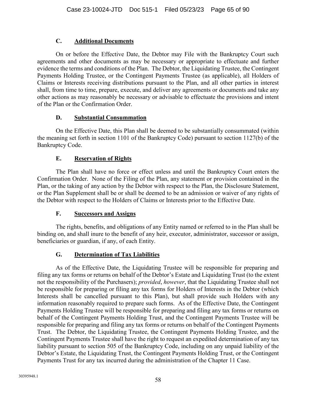 5830395948.1C.附加文件在生效日期当日或之前,债务人可向破产法院提交必要或适当的协议和其他文件,以执行计划的条款和条件,并提供进一步的证据。债务人、清算受托人、持有或有付款的受托人或或有付款的受托人(如适用)、根据本计划接受分配的所有债权或权益持有人以及所有其他利益方应不时准备、执行、交付任何协议或文件,并采取任何其他合理必要或可取的行动,以实现本计划或确认令的规定和意图。D.实质性完成在生效日期,本计划应被视为根据《破产法》第1127(b)条实质性完成(在《破产法》第1101条所述的含义内)。保留权利除非破产法院下达确认令,否则本计划不具有任何效力或效力。本计划的提交、本计划所载的任何声明或规定,或债务人就本计划、披露声明或本计划补充书采取的任何行动,均不应或不应被视为承认或放弃债务人在生效日期之前对债权或权益持有人的任何权利。F.继承人和受让人计划中指定或提及的任何实体的权利、利益和义务应对每个实体的任何继承人、遗嘱执行人、管理人、继承人或受让人、受益人或监护人(如果有的话)具有约束力,并对其有利。G.税务责任的厘定自生效日期起,清盘受托人将负责代表债务人的遗产及清盘信托拟备及提交任何税务表格或申报表(在买方不负责的范围内);但清盘受托人无须负责为债务人的权益持有人拟备或提交任何税务表格(该等权益须根据本计划注销),但须向该等持有人提供拟备该等表格所合理需要的任何资料。自生效日期起,或有付款持有受托人将负责代表或有付款持有信托编制和提交任何税表或申报表,而或有付款受托人将负责代表或有付款信托编制和提交任何税表或申报表。债务人、清算受托人、持有或有付款的受托人和或有付款的受托人有权要求根据《破产法》第505条迅速确定任何纳税义务,包括债务人遗产、清算信托、或有付款持有信托或或有付款信托在管理第11章案件期间发生的任何纳税义务。判例23-10024-JTD Doc 515-1提交05/23/23第65页,共90页
