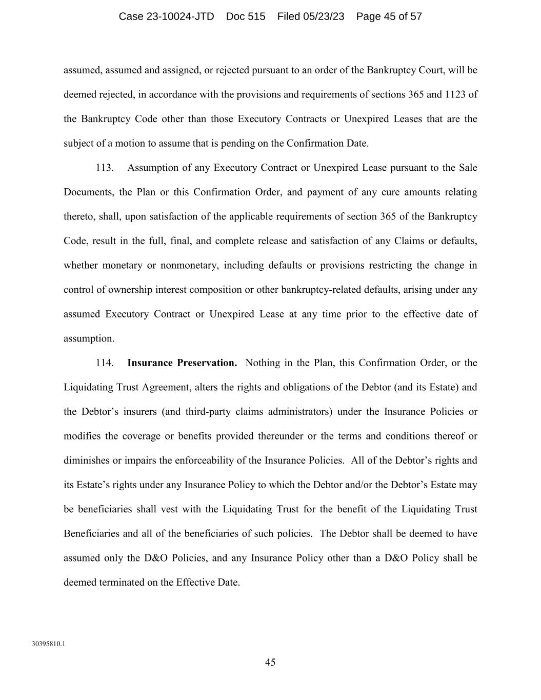 45303958 10.1根据破产法院的命令假定、假定和转让,或被拒绝,根据《破产法》第365条和第1123条的规定和要求,将被视为被拒绝,但在确认日期仍未决定的假定动议所涉及的执行合同或未到期租约除外。113.根据销售文件、计划或本确认令承担任何执行合同或未到期租约,并支付与之相关的任何补救金额,在满足《破产法》第365条的适用要求后,应导致在承担生效日期之前的任何时间,根据任何假定的执行合同或未到期租约产生的任何债权或违约,无论是金钱的还是非金钱的,包括违约或限制所有权权益构成控制权变更的条款或其他与破产相关的违约,全部、最终和完全解除和清偿。114.保险保全。本计划、本确认令或清算信托协议均不改变债务人(及其财产)和债务人的保险人(及第三方索赔管理人)在保险单下的权利和义务,也不修改根据保险单提供的保险范围或利益或其条款和条件,或削弱或损害保险单的可执行性。债务人和/或债务人遗产可能成为受益人的任何保险单所规定的债务人的所有权利及其遗产的权利,均应归属清算信托,以利于清算信托受益人和该等保险单的所有受益人。债务人应被视为仅承担了D & O保单,除D & O保单外的任何保险单应被视为在生效日期终止。判例23-10024-JTD Doc 515提交05/23/23第45页,共57页