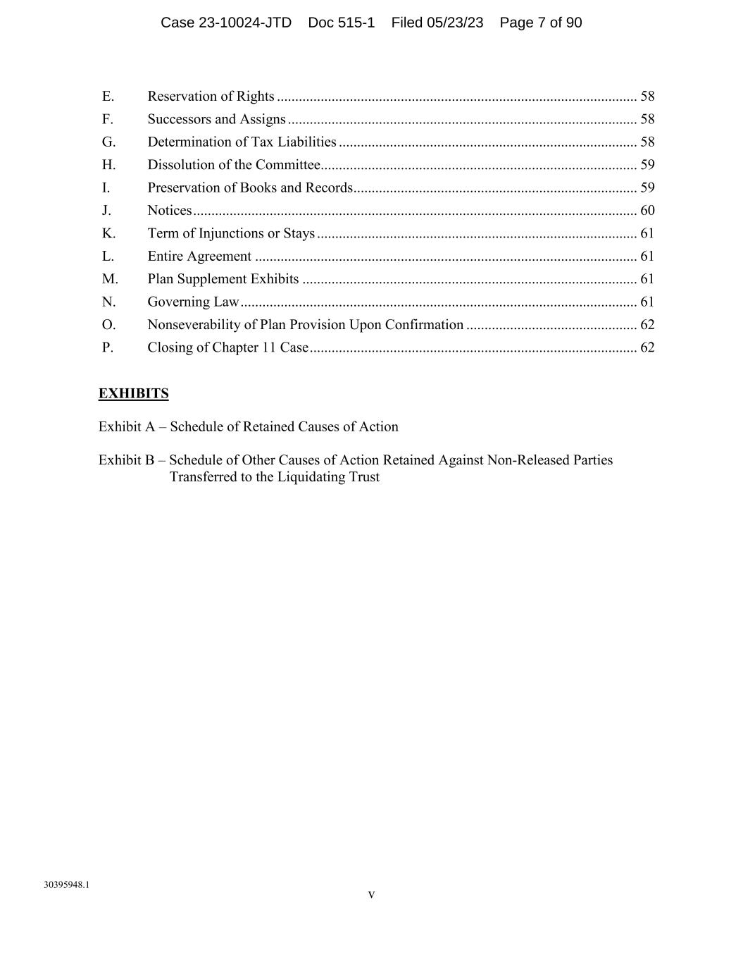 v 30395948.1 E.权利保留...................................................................................................................58 F.继承人和受让人.......................................................................................................58 G.税务责任的确定...................................................................................58 H.委员会的解散.......................................................................................59 I.账簿的保存及记录...........................................................................................................59 J.通知.................................................................................................................................60 K.禁止令或逗留期限.................................................................................................61 L.整份协议.................................................................................................................61 M.计划补充证明..................................................................................................61 N.管辖法律.................................................................................................61 O.计划规定经确认后的不可分割性.................................................................62 P.第11章案件的终结.....................................................................................62 EXHIBITS 附件 A –保留的诉讼因由附表附件 B –针对转移至清算信托案件的未释放各方保留的其他诉讼因由附表23-10024-JTD Doc 515-1 Filed 05/23/23 Page 7 of 90
