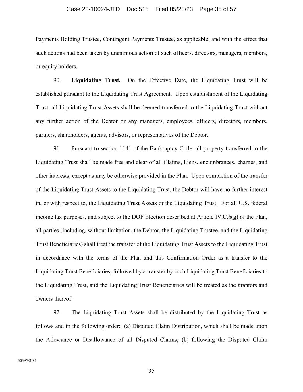 3530395810.1 Payments Holding Trustee,或有付款受托人,视情况而定,并表明此类行动是由这些高级职员、董事、经理、成员或股东一致采取的。90.清算信托。于生效日期,清算信托将根据清算信托协议成立。清算信托成立后,所有清算信托资产应视为转移至清算信托,无须债务人或债务人的任何经理、雇员、高级职员、董事、成员、合伙人、股东、代理人、顾问或代表采取任何进一步行动。91.根据《破产法》第1141条,转让给清算信托的所有财产应免受所有债权、留置权、产权负担、押记和其他权益的影响,但计划中另有规定的除外。在将清算信托资产转移至清算信托完成后,债务人将不再拥有清算信托资产或清算信托的权益,也不再拥有清算信托资产或清算信托的权益。就所有美国联邦所得税而言,并受计划第IV.C.6(g)条所述的自由度选举的约束,所有各方(包括但不限于债务人、清算受托人和清算信托受益人)应根据计划和本确认令的条款将清算信托资产转移至清算信托视为转移至清算信托受益人,然后由清算信托受益人转移至清算信托,清算信托受益人将被视为设保人和所有者。92.清算信托资产应由清算信托按以下顺序分配:(a)有争议的债权分配,应在所有有争议的债权得到允许或不允许的情况下进行;(b)按照有争议的债权案件23-10024-JTD Doc 515提交05/23/23第35页,共57页