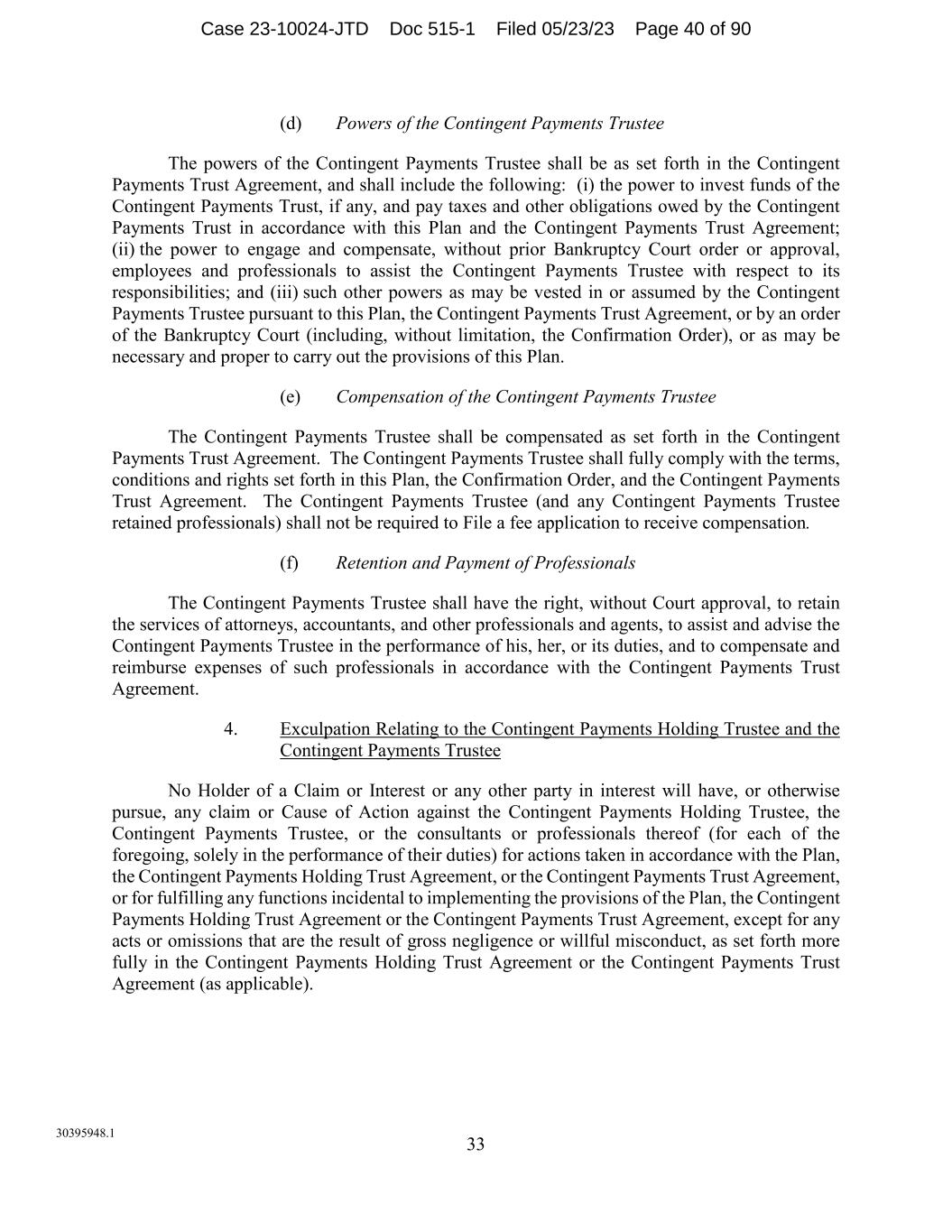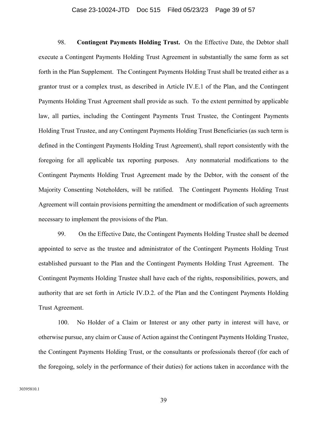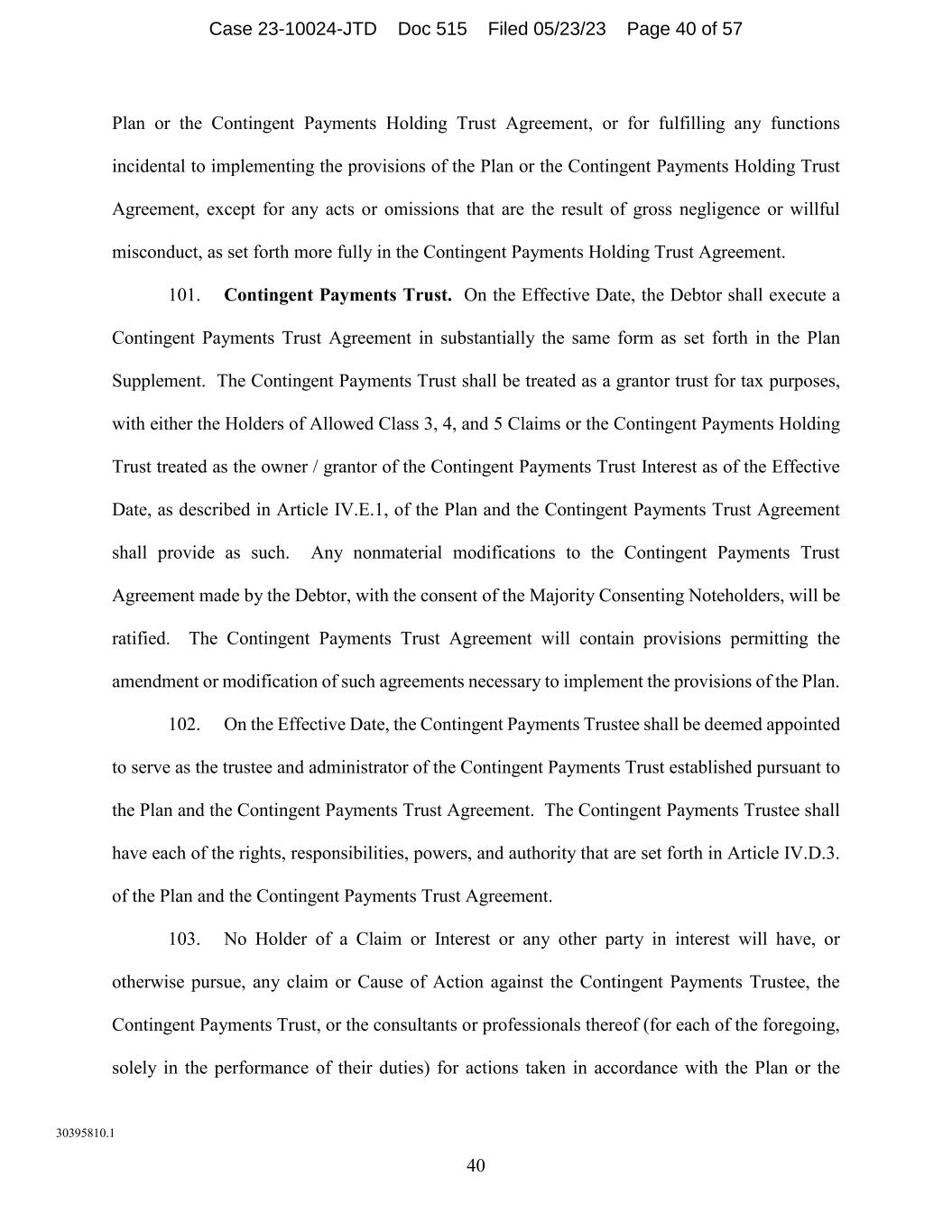 39 30395810.1 98.或有付款持有信托。自生效之日起,债务人应以与计划补充文件中规定的基本相同的形式签署或有付款持有信托协议。如计划第IV.E.1条所述,或有付款持有信托应被视为设保人信托或复杂信托,《或有付款持有信托协议》应作此规定。在适用法律允许的范围内,所有各方,包括或有付款信托受托人、或有付款持有信托受托人和任何或有付款持有信托受益人(该术语在《或有付款持有信托协议》中定义),应为所有适用的报税目的,按照上述规定进行报告。债务人对《或有付款持有信托协议》所作的任何非实质性修改,经多数同意票据持有人同意后,将予以批准。《或有付款信托协议》将载有规定,允许为执行该计划的规定而对这些协议进行必要的修订或修改。99.在生效日期,或有付款持有受托人应被视为被指定为根据本计划和或有付款持有信托协议设立的或有付款持有信托的受托人和管理人。或有付款持有受托人应享有本计划第IV.D.2条和《或有付款持有信托协议》中规定的各项权利、责任、权力和授权。100.任何索偿或利息持有人或任何其他利害关系方都不会对或有付款持有受托人、或有付款持有信托或其顾问或专业人士(就上述每一项而言,仅在履行其职责时)就根据案件23-10024-JTD Doc 515采取的行动提出任何索偿或诉讼因由,或以其他方式提起诉讼。提交05/23/23第39页,共57页