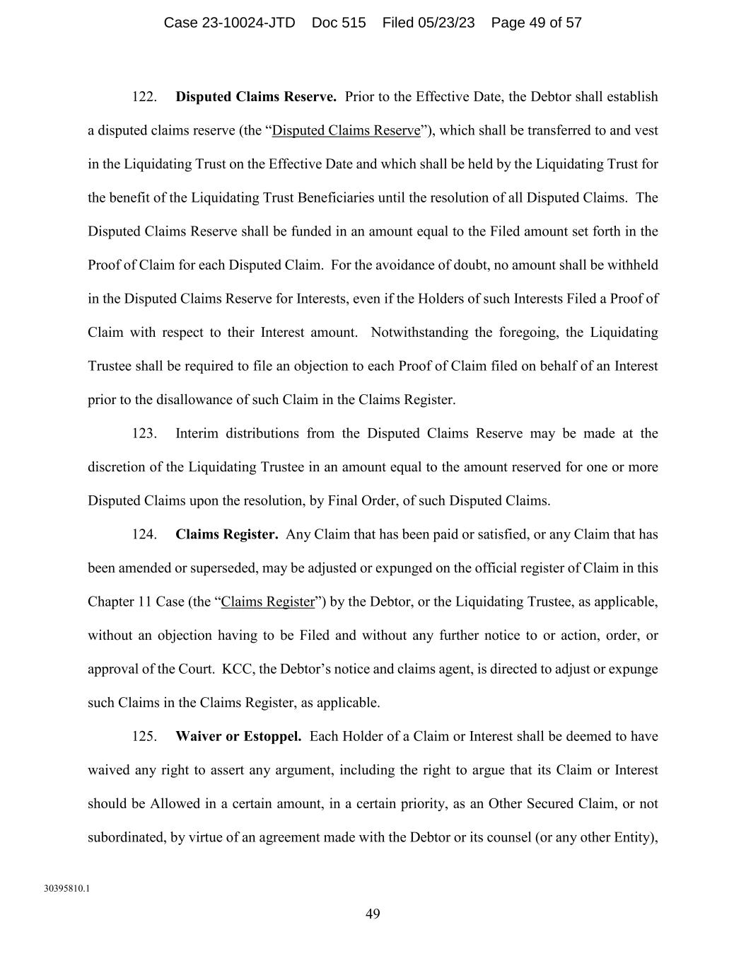 49 30395810.1 122.争议索赔准备金。在生效日期之前,债务人应设立争议债权准备金(“争议债权准备金”),该准备金应在生效日期转移至清算信托并归属于清算信托,并由清算信托为清算信托受益人的利益持有,直至所有争议债权得到解决。争议索赔储备金的资金数额应与每项争议索赔的索赔证明中所列的申报数额相等。为免生疑问,即使争议债权的持有人就其利息数额提出了索赔证明,也不得在争议债权的利息准备金中扣减任何数额。尽管有上述规定,清算受托人仍须在索赔登记簿上对代表利息提交的每一份索赔证明提出反对。123.争议债权储备金的临时分配可由清算受托人酌情决定,数额相当于一项或多项争议债权在争议债权通过最后命令解决后所保留的数额。124.索赔登记册。任何已获支付或满足的申索,或任何已被修订或取代的申索,可由债务人或清算受托人(视情况而定)在本第11章个案的正式申索登记册(“申索登记册”)上加以调整或删除,而无须提出反对,亦无须向法院发出任何进一步通知或采取行动、命令或批准。KCC,即债务人的通知和索赔代理人,被指示酌情调整或删除索赔登记册中的这类索赔。125.放弃或反悔。债权或利息的每一持有人均应被视为放弃了主张任何论点的任何权利,包括主张其债权或利息应根据与债务人或其律师(或任何其他实体)达成的协议,以一定数额、以一定的优先权作为其他有担保债权被允许,或不从属于该债权或利息的权利,案例23-10024-JTD Doc 515提交05/23/23第49页,共57页