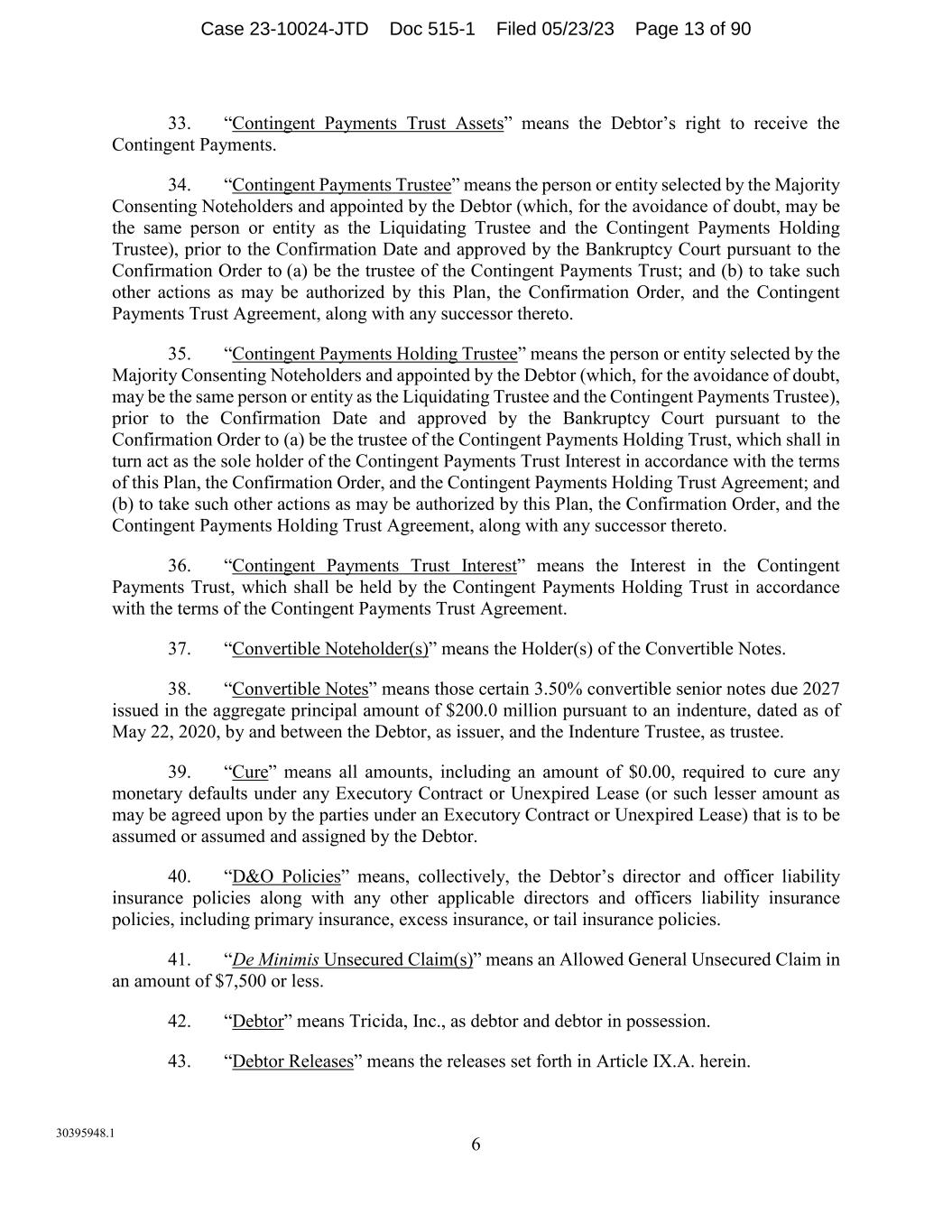 6 30395948.1 33.“或有付款信托资产”是指债务人收取或有付款的权利。34.“或有付款受托人”指在确认日期之前,由多数同意票据持有人选定并由债务人(为免生疑问,该债务人可能与清算受托人和或有付款持有受托人是同一个人或实体)指定的个人或实体,并经破产法院根据确认令批准(a)成为或有付款信托的受托人;以及(b)采取本计划、确认令和或有付款信托协议及其任何后续协议可能授权的其他行动。35.“或有付款受托人”是指在确认日期之前,由多数同意票据持有人选定并由债务人(为免生疑问,该债务人可能与清算受托人和或有付款受托人是同一个人或实体)指定的个人或实体,并经破产法院根据确认令批准(a)为或有付款持有信托的受托人,而后者应根据本计划的条款(确认令)作为或有付款信托权益的唯一持有人,及或有付款持有信托协议;及(b)采取本计划、确认令及或有付款持有信托协议授权的其他行动,以及该协议的任何后续行动。36.“或有付款信托利息”是指或有付款信托中的利息,应由或有付款持有信托根据或有付款信托协议的条款持有。37.“可转换票据持有人”是指可转换票据的持有人。38.“可转换票据”是指由作为发行人的债务人和作为受托人的契约受托人根据截至2020年5月22日的契约发行的本金总额为2亿美元的2027年到期的3.50%可转换优先票据。39.“Cure”是指债务人承担或承担和转让的所有金额,包括0.00美元,以弥补任何执行合同或未到期租约(或双方在执行合同或未到期租约下可能商定的较低金额)下的任何金钱违约。40.“D & O保单”统称为债务人的董事和高级职员责任保险,以及任何其他适用的董事和高级职员责任保险,包括主险、超额险或尾险。41.“De Minimis Unsecured Claim(s)”是指允许的一般无担保债权,金额在7500美元或以下。42.“债务人”是指Tricida, Inc.,作为债务人和占有的债务人。43.“债务人释放”是指IXA条中规定的释放。判例23-10024-JTD Doc 515-1提交05/23/23第13页,共90页