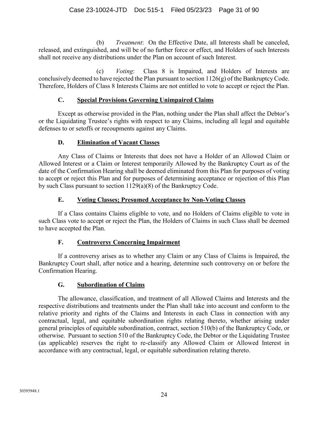 2430395948.1(b)处理:自生效之日起,所有权益将被取消、释放和消灭,且不再具有任何效力或效力,此类权益的持有人不得因此类权益而收到本计划下的任何分配。(c)投票:第8类受损,而权益持有人根据《破产法》第1126(g)条被确凿地当作已拒绝该计划。因此,第8类权益申索的持有人无权投票接受或否决该计划。C.关于未受损害债权的特别规定除本计划另有规定外,本计划不影响债务人或清算受托人对任何债权的权利,包括对任何债权的所有法律和衡平法抗辩、抵销或补偿。D.消除空缺类别任何类别的债权或权益,如在确认聆讯日期并无破产法庭暂时准许的债权或权益的持有人,即视为从本计划中消除,以投票接受或否决本计划,并根据《破产法》第1129(a)(8)条决定该类别接受或拒绝本计划。E.投票类别;非投票类别的假定接受如果某一类别包含有资格投票的债权,而没有资格在该类别中投票的债权持有人投票接受或否决该计划,则该类别中的债权持有人应被视为已接受该计划。F.关于损害的争议如果对任何债权或任何类别的债权是否受到损害产生争议,破产法院应在通知和聆讯后,在确认聆讯时或之前对该争议作出裁定。G.债权的排序。所有允许的债权和权益的允许、分类和处理,以及计划下的相应分配和处理,应考虑并符合每一类债权和权益在与之相关的任何合同、法律和衡平法排序上的相对优先权和权利,无论是根据衡平法排序的一般原则、合同、《破产法》第510(b)条或其他条款产生的。根据《破产法》第510条,债务人或清算受托人(视情况而定)保留根据与此有关的任何合同、法律或衡平法排序,对任何允许的债权或允许的权益进行重新分类的权利。判例23-10024-JTD Doc 515-1提交05/23/23第31页,共90页
