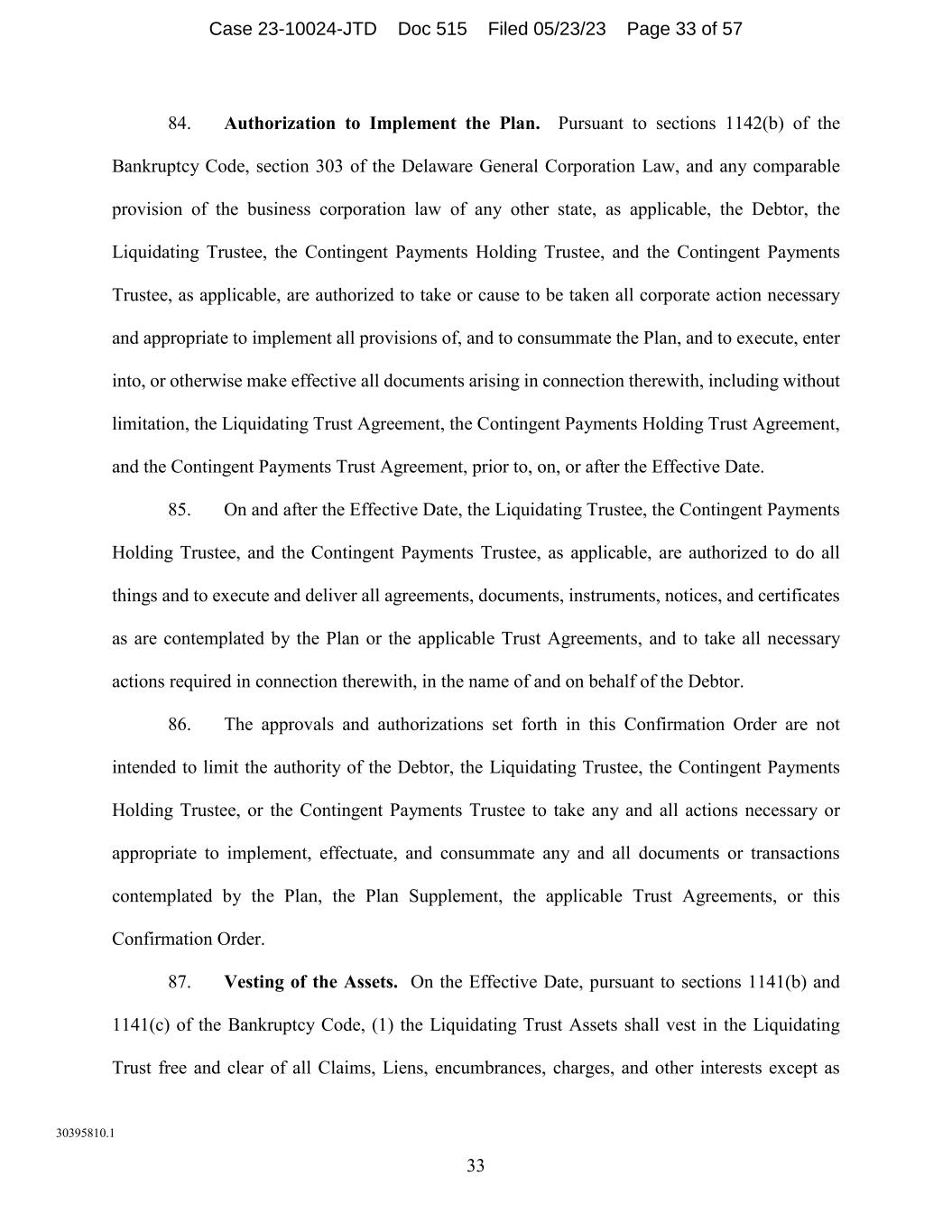 33 30395810.1 84.授权执行该计划。根据《破产法》第1142(b)条、《特拉华州一般公司法》第303条以及任何其他州的商业公司法的任何类似规定(如适用),债务人、清算受托人、或有付款受托人和或有付款受托人(如适用)有权采取或促使采取一切必要和适当的公司行动,以执行和完善本计划的所有规定,并执行、订立或以其他方式使与之有关的所有文件生效,包括但不限于《清算信托协议》,或有付款持有信托协议和或有付款信托协议,在生效日期之前、之日或之后。85.在生效日期当日及之后,清算受托人、持有或有付款的受托人及或有付款的受托人(如适用)有权以债务人的名义及代表债务人采取一切行动,执行和交付本计划或适用的信托协议所设想的所有协议、文件、文书、通知和证书,并采取与此有关的一切必要行动。86.本确认令所载的批准和授权,并不是为了限制债务人、清算受托人、或有付款持有受托人或或有付款受托人采取任何和所有必要或适当行动,以执行、执行和完成计划、计划补充、适用的信托协议或本确认令所设想的任何和所有文件或交易的权力。87.资产的归属。在生效日期,根据《破产法》第1141(b)和1141(c)条,(1)清算信托资产应归属于清算信托,不受所有债权、留置权、产权负担、押记和其他权益的影响,但案件23-10024-JTD Doc 515提交05/23/23第33页,共57页