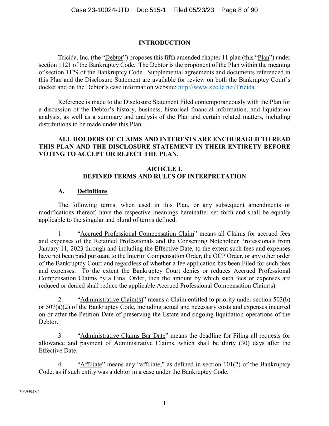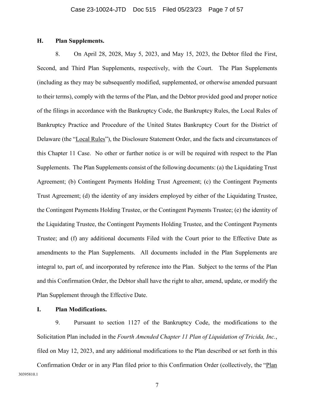 730395810.1 H.补充计划。8.2028年4月28日、2023年5月5日和2023年5月15日,债务人分别向法院提交了第一、第二和第三计划补充文件。计划补充文件(包括随后可能根据其条款进行修改、补充或以其他方式修订的补充文件)符合计划的条款,债务人根据《破产法》、《破产规则》、《美国特拉华州破产法院破产实践和程序地方规则》(“地方规则”)、《披露声明令》以及第11章案件的事实和情况,提供了良好和适当的备案通知。目前或将来无须就《计划补编》发出任何其他或进一步的通知。计划补充文件包括以下文件:(a)清算信托协议;(b)或有付款持有信托协议;(c)或有付款信托协议;(d)清算受托人、或有付款持有受托人或或或有付款受托人所雇用的任何内部人的身份;(e)清算受托人、或有付款持有受托人和或有付款受托人的身份;以及(f)在生效日期之前作为计划补充文件的修订提交法院的任何其他文件。所有列入《计划补编》的文件都是《计划》的组成部分,是《计划》的一部分,并以参考方式纳入《计划》。在不违反本计划及本确认令的规定下,债务人有权在本计划补充文件生效日期之前更改、修订、更新或修改该补充文件。一.计划修改。9.根据《破产法》第1127条,2023年5月12日提交的《Tricida, Inc.第四次修订第11章清算计划》中所载的对征求计划的修改,以及本确认令或在本确认令之前提交的任何计划中描述或阐述的对计划的任何其他修改(统称为“计划案例23-10024-JTD Doc 515提交05/23/23第7页,共57页)